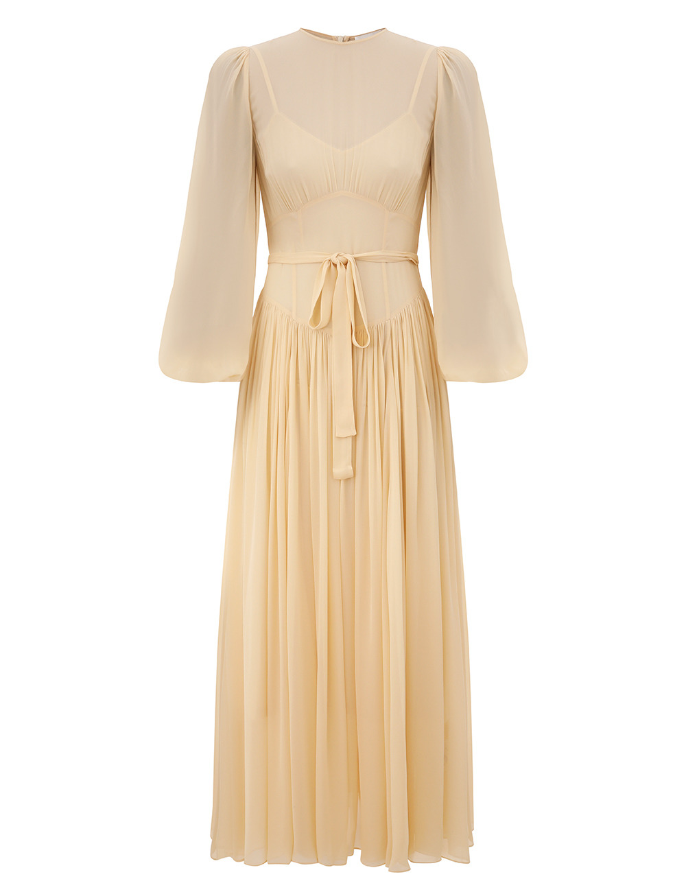 ITEM DETAILS The Hypnotic Blouson Dress in Cream from our Fall 2025 Collection, Hypnotic. A maxi dress featuring a fixed bodice, heavy gathering throughout, long blouson sleeves with elasticated cuffs, finished with a centre back zip. - Long sleeve maxi dress - Fixed waistband bodice - Removable self-tie waist belt - Elasticated cuffs - Centre back zip closure - Comes with a separate slip Style Code: 5288DF251 SIZE DETAILS 0P 0 1 2 3 4 Length 51.5 56 56.5 56.5 56.5 57 Bust 29 31.5 34 35.5 38 39.5 Waist 26 27.5 30 31.5 34 35.5 Sleeve 24 25.5 26 26.5 26.5 27 Designed to be slightly fitted at the bust and waist, loose at the hip This garment fits true to size Available in size 0P, suited to clients who are under 5'3"/ 160cm Model is 5'9.5"/178 cm, bust size 32C/10C and wears a size 0 Item measurements are in inches CARE INSTRUCTIONS Main: 100% viscose; slip: 86% recycled polyester, 14% elastane Dry clean only code f (hydrocarbon only); Remove any detachable trims prior to dry cleaning; Cover to protect trim; Cool iron with protective cloth; Light steam only; Do not spot clean Gentle cold hand wash separately with mild detergent Remove any detachable trims prior to cleaning Cover to protect trim; Do not soak, rub or wring Do not bleach Do not tumble dry Dry flat in shade Cool iron with protective cloth Do not spot clean Dry cleanable code p Always check the label or care card for specific care instructions.
