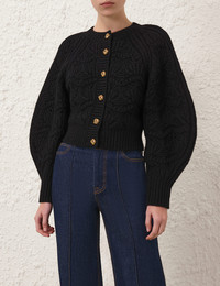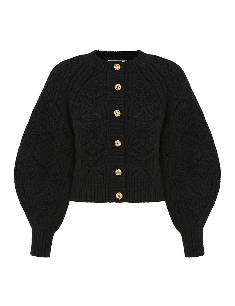 ITEM DETAILS The Hypnotic Cable Knit Cardigan in Black from our Fall 2025 Collection, Hypnotic. A wool long sleeve cardigan featuring a rounded neckline, gold buttons down the centre front and fitted cuffs. - Textured quilted knit cardigan - Long billow sleeves with fitted cuffs - Ribbed neckline, cuffs and hem - Functional gold buttons down the centre front Style Code: 6095TF251 SIZE DETAILS 0P 0 1 2 3 4 Length 44 47 48 49 49 50 Bust 80 84 90 96 102 106 Sleeve 57 62 63 64 65 66 Designed for a regular fit This garment fits true to size Available in size 0P, suited to clients who are under 5'3"/ 160cm Model is 5'9.5"/178 cm, bust size 32C/10C and wears a size 0 Item measurements have been rounded to the nearest cm CARE INSTRUCTIONS Main : 100% wool contrast : 99% wool 1% other fibres Dry clean only code f (hydrocarbon only); Remove any detachable trims prior to dry cleaning; Cover to protect trim; Cool iron with protective cloth; Do not spot clean; Store garment flat do not hang Always check the label or care card for specific care instructions.