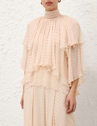 ITEM DETAILS The Hypnotic Cascading Blouse in Cream Dot from our Fall 2025 Collection, Hypnotic. A short sleeve blouse featuring cascading frills and a self-tie neck detail. - Stand collar with self-tie necktie - Gathered detailing throughout - Asymmetrical frilled tiers - Asymmetrical hem - Invisible zip closure at centre back - Comes with a separate cami Style Code: 5258TF251 SIZE DETAILS 0P 0 1 2 3 4 Length 64 67 68 69 69 70 Designed for a relaxed, loose fit This garment fits true to size Available in size 0P, suited to clients who are under 5'3"/ 160cm Model is 5'9.5"/178 cm, bust size 32C/10C and wears a size 0 Item measurements have been rounded to the nearest cm CARE INSTRUCTIONS Main: 100% viscose; slip: 86% recycled polyester, 14% elastane Dry clean only code f (hydrocarbon only); Remove any detachable trims prior to dry cleaning; Cover to protect trim; Do not iron; Light steam; Do not spot clean Gentle cold hand wash separately with mild detergent Remove any detachable trims prior to cleaning Cover to protect trim; Do not soak, rub or wring Do not bleach Do not tumble dry Dry flat in shade Cool iron with protective cloth Do not spot clean Dry cleanable code p Always check the label or care card for specific care instructions.