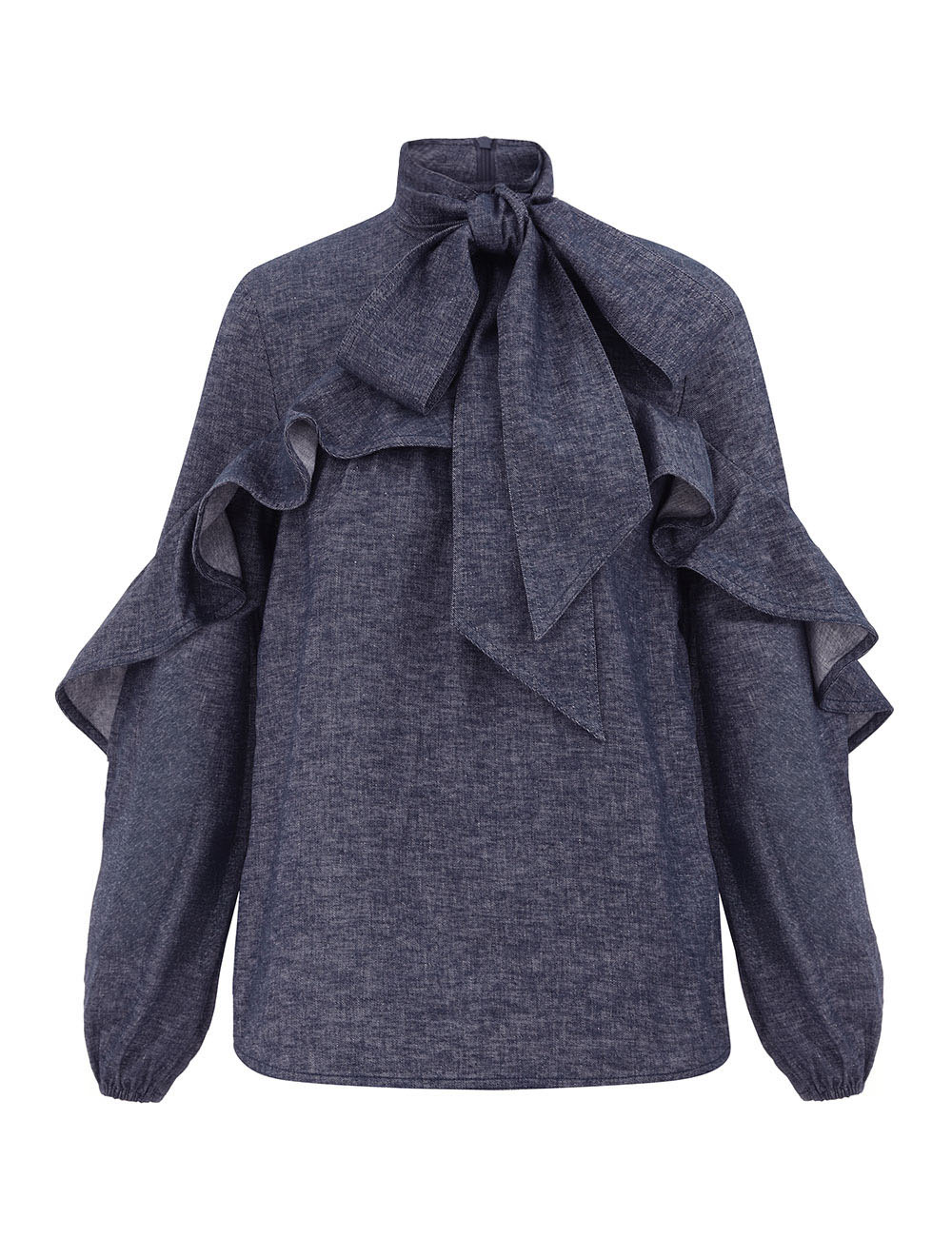 ITEM DETAILS The Hypnotic Chambray Blouse in Chambray from our Fall 2025 Collection, Hypnotic. A linen blend long sleeve blouse featuring a stand collar with pussybow necktie, elasticated cuffs and invisible centre back zip closure. - Relaxed blouse - Self rouleau tie at neckline - Blouson sleeves with elasticated cuffs - Gathered at front and back - Invisible zip closure at centre back - Tiered frills throughout Style Code: 5269TF251 SIZE DETAILS 0P 0 1 2 3 4 Length 59 63 64 65 65 66 Bust 100 104 110 116 122 126 Sleeve 56 60 61 61 63 63 Designed for a slightly loose fit, with a closer fit at the bust This garment fits true to size Available in size 0P, suited to clients who are under 5'3"/ 160cm Model is 5'9.5"/178 cm, bust size 32C/10C and wears a size 0 Item measurements have been rounded to the nearest cm CARE INSTRUCTIONS Main: 51% linen, 47% cotton, 2% elastane Dry clean only code f (hydrocarbon only); Remove any detachable trims prior to dry cleaning; Cover to protect trim; Cool iron with protective cloth; Light steam only; Do not spot clean Always check the label or care card for specific care instructions.