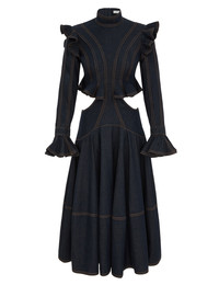 ITEM DETAILS The Hypnotic Denim Midi Dress in Night Sky from our Fall 2025 Collection, Hypnotic. A denim midi dress featuring a stand collar, peplum waist, side cutouts, finished with a flared skirt and frill detailing throughout. - 100% cotton denim - Long sleeve with fluted cuffs - Frill detailing at the shoulders, waist, and cuffs - Topstitching throughout - Cutouts at both sides of bodice - Gold metal zipper at centre back closure Runway: This style was featured on the F25 Runway. Style Code: 4618DF251 SIZE DETAILS 0P 0 1 2 3 4 Length 45.5 50 50.5 50.5 51 51 Bust 32.5 34.5 37 38.5 41 42.5 Hip 38 39.5 41.5 43.5 45.5 47 Sleeve 24 25.5 26 26 26.5 27 Designed to be fitted at the bust, waist, and hips This garment fits true to size Available in size 0P, suited to clients who are under 5'3"/ 160cm Model is 5'9.5"/178 cm, bust size 32C/10C and wears a size 0 Item measurements are in inches CARE INSTRUCTIONS 100% cotton Dry clean only code f (hydrocarbon only); Remove any detachable trims prior to dry cleaning; Cover to protect trim; Do not steam; Cool iron with protective cloth; Do not spot clean Always check the label or care card for specific care instructions.
