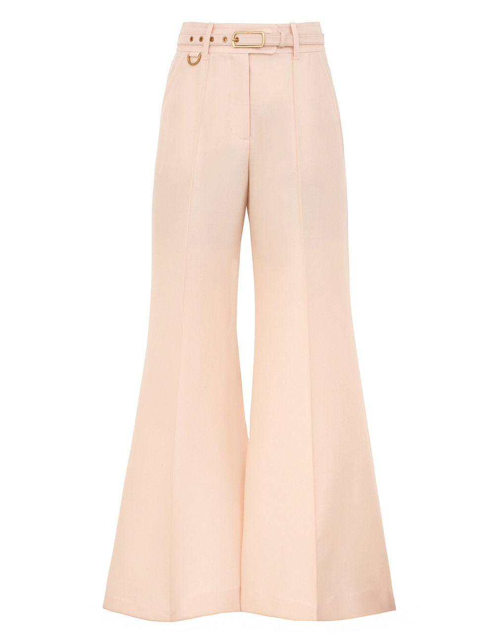 ITEM DETAILS The Hypnotic Flare Pant in Cream from our Fall 2025 Collection, Hypnotic. A wool blend pant featuring a wide flare silhouette, centre front pintucks and side seam pockets. - Wool blend fabric - Centre front metal fly - Hook and bar closure - Two front side pockets - Non-functional back pockets - Topstitch detailing throughout - Removable self covered belt Style Code: 2951PF251 SIZE DETAILS 0P 0 1 2 3 4 Length 102 112 113 114 114 115 Waist 66 70 74 80 84 90 Hip 92 96 102 108 112 118 Inseam 80 88 88 88 88 88 Designed to be fitted at waist and hips, relaxed through the legs Mid-rise waist with a full-length leg This garment fits true to size Available in size 0P, suited to clients who are under 5'3"/ 160cm Model is 5'9.5"/178 cm, bust size 32C/10C and wears a size 0 Item measurements have been rounded to the nearest cm CARE INSTRUCTIONS Main: 92% wool, 8% silk; contrast: 55% polyester, 45% cotton; lining: 75% viscose, 25% silk Dry clean only code f (hydrocarbon only); Remove any detachable trims prior to dry cleaning; Cover to protect trim; Cool iron with protective cloth; Light steam only; Do not spot clean Always check the label or care card for specific care instructions.