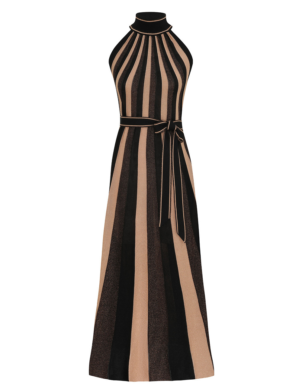 ITEM DETAILS The Hypnotic Halter Midi Dress in Metallic Gold Stripe from our Fall 2025 Collection, Hypnotic. A knit midi dress featuring a halter neckline, self-tie waist, finished with contrasting stripes and a pleated skirt. - Metallic knit midi dress - Halter silhouette - Removable self-tie waist belt - Drop style skirt Style Code: 4953DF251 SIZE DETAILS 0P 0 1 2 3 4 Length 104 115 116 117 117 118 Bust 80 86 92 96 102 106 Designed to be slightly fitted at the bust and waist, loose at the hip This garment fits true to size Available in size 0P, suited to clients who are under 5'3"/ 160cm Model is 5'9.5"/178 cm, bust size 32C/10C and wears a size 0 Item measurements have been rounded to the nearest cm CARE INSTRUCTIONS 88% viscose 7% metallized fibre 5% polyamide Dry clean only code f (hydrocarbon only); Remove any detachable trims prior to dry cleaning; Cover to protect trim; Cool iron with protective cloth; Do not spot clean; Store garment flat do not hang Always check the label or care card for specific care instructions.