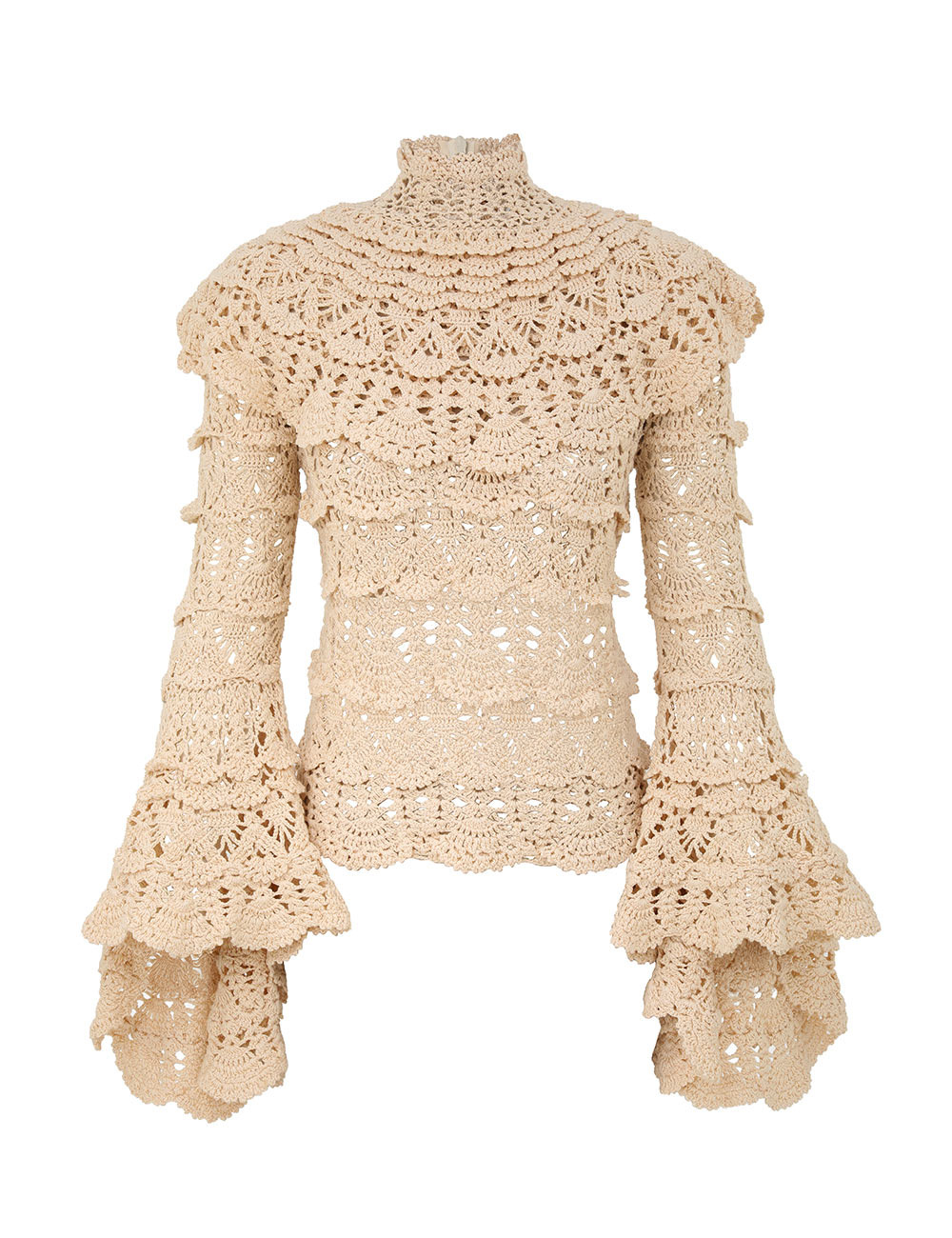 ITEM DETAILS The Hypnotic Hand Crochet Sweater in Chalk from our Fall 2025 Collection, Hypnotic. A crochet long sleeve sweater featuring a scalloped stand collar, back neck button closure, and exaggerated cuffs. - Hand-crocheted sweater - Long sleeves with fluted cuffs - Scalloped edging throughout - Cascading ruffles - Handmade, slight variations may occur between styles Runway: This style was featured on the F25 Runway. Style Code: 4852TF251 SIZE DETAILS 0P 0 1 2 3 4 Length 19.5 20.5 21 21.5 21.5 21.5 Bust 30 32.5 34 36 38 40 Sleeve 19.5 21 21.5 21.5 21.5 22 Designed for a close fit This garment fits true to size Available in size 0P, suited to clients who are under 5'3"/ 160cm Model is 5'9.5"/178 cm, bust size 32C/10C and wears a size 0 Item measurements are in inches CARE INSTRUCTIONS 100% cotton Dry clean only code f (hydrocarbon only); Remove any detachable trims prior to dry cleaning; Cover to protect trim; Cool iron with protective cloth; Do not spot clean; Store garment flat do not hang Always check the label or care card for specific care instructions.
