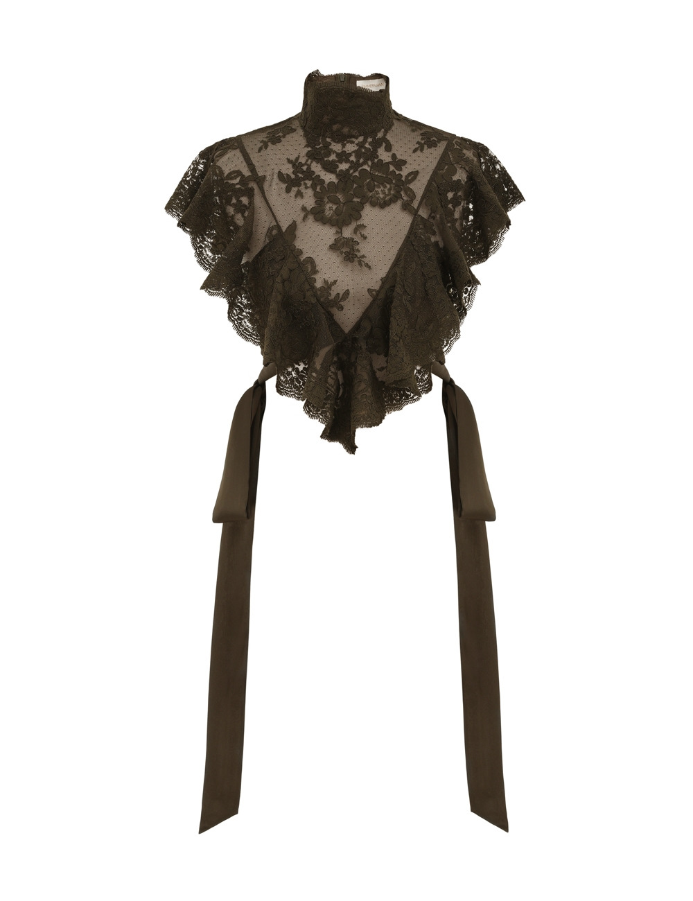 ITEM DETAILS The Hypnotic Lace Bodice in Olive from our Fall 2025 Collection, Hypnotic. A lace bodice featuring ruffle detailing and decorative side bow ties. - Centre back invisible zip closure - Side bodice panel with additional side zip - Lace trim applique around collar and frills Runway: This style was featured on the F25 Runway. Style Code: 6170TF251 SIZE DETAILS 0P 0 1 2 3 4 Length 18.5 19 19.5 19.5 19.5 20 Bust 32.5 34.5 36 38.5 40 42.5 Designed to be slightly fitted at the bust This garment fits true to size Available in size 0P, suited to clients who are under 5'3"/ 160cm Model is 5'9.5"/178 cm, bust size 32C/10C and wears a size 0 Item measurements are in inches CARE INSTRUCTIONS Main: 100% polyester; contrast: 100% silk Dry clean only code f (hydrocarbon only); Remove any detachable trims prior to dry cleaning; Cover to protect trim; Do not steam; Cool iron with protective cloth; Do not spot clean Always check the label or care card for specific care instructions.