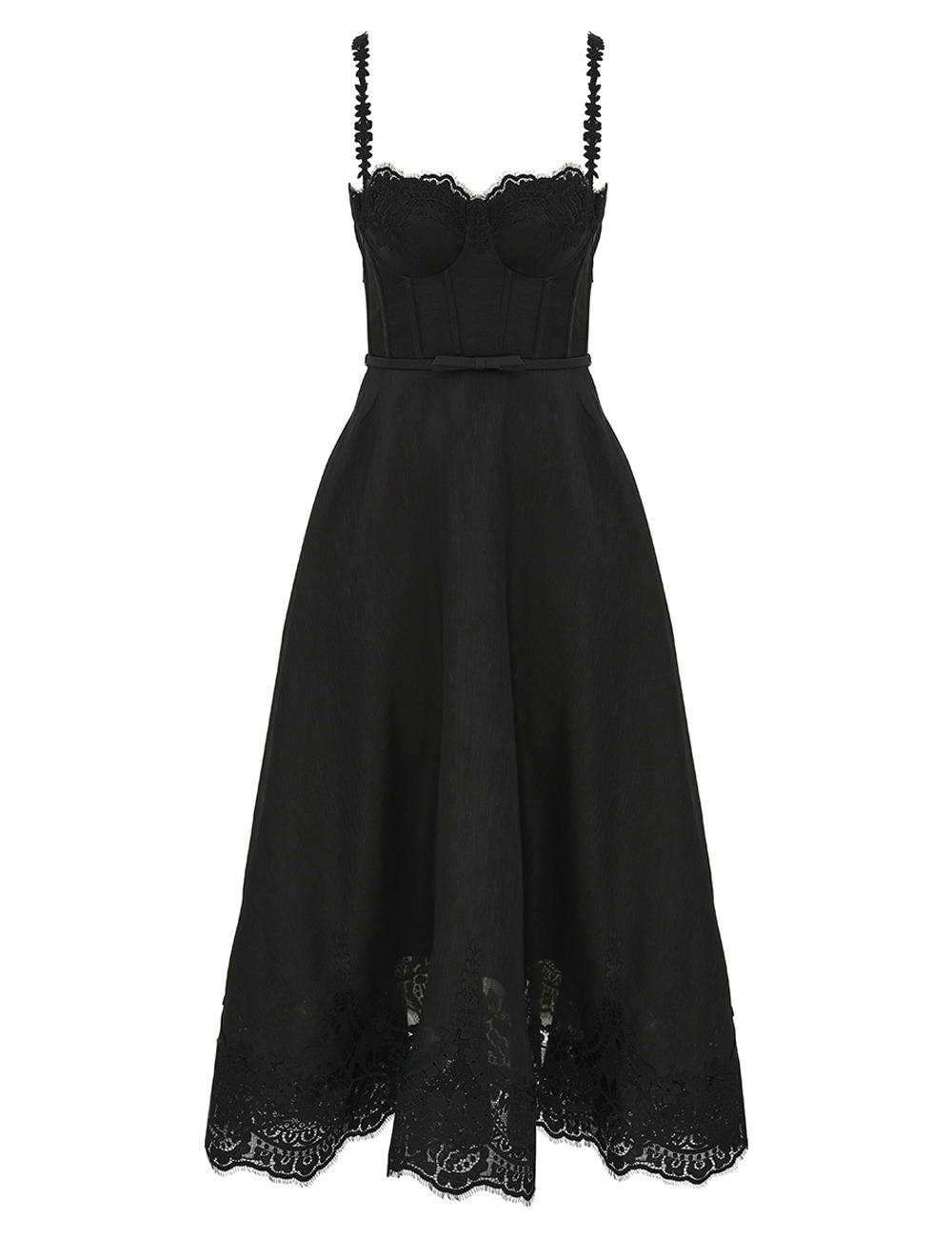 ITEM DETAILS The Hypnotic Lace Trim Gown in Black from our Fall 2025 Collection, Hypnotic. A silk linen midi gown featuring a fitted bustier, shirred back and adjustable shoulder straps. - Lined bodice with underwire bust support - Side seam pockets - Removable self covered bow belt - Invisible zip at centre back with hook and eye closure - Lace trim at bust, straps, and hem Style Code: 5179DF251 SIZE DETAILS 0P 0 1 2 3 4 Length 93 102 102 102 102 102 Waist 62 64 70 76 82 86 Designed to be fitted across bust and waist, loose at the hip This garment fits true to size Available in size 0P, suited to clients who are under 5'3"/ 160cm Model is 5'9.5"/178 cm, bust size 32C/10C and wears a size 0 Item measurements have been rounded to the nearest cm CARE INSTRUCTIONS Main: 53% linen, 47% silk; contrast: 100% polyester; lining: 100% viscose Dry clean only code f (hydrocarbon only); Remove any detachable trims prior to dry cleaning; Cover to protect trim; Cool iron with protective cloth; Light steam only; Do not spot clean Always check the label or care card for specific care instructions.