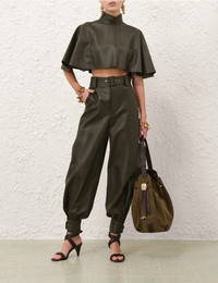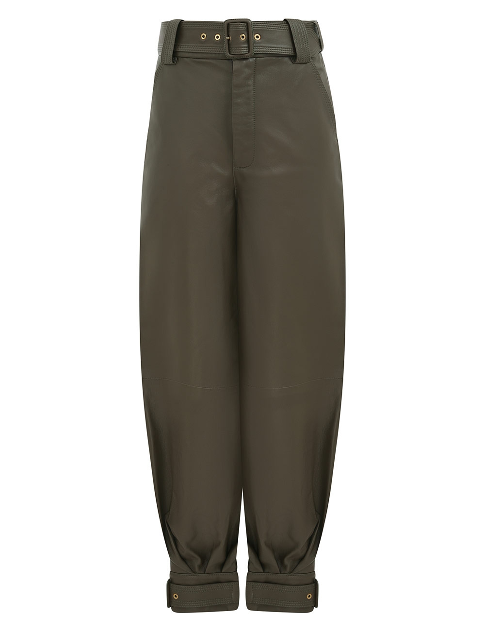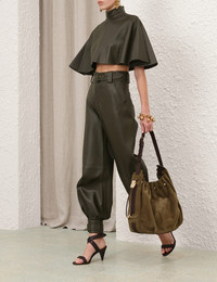 ITEM DETAILS The Hypnotic Leather Harem Pant in Olive from our Fall 2025 Collection, Hypnotic. A high waisted leather harem pant featuring a fitted waistband, a removable belt and buckle detailing on the cuffs. - Sheep leather pant - Centre front metal zip fly - Removable buckle belt - Fitted ankle cuffs with adjustable buckle straps - Functional side pockets Runway: This style was featured on the F25 Runway. Style Code: 4985PF251 SIZE DETAILS 0P 0 1 2 3 4 Length 94 102 103 104 104 105 Waist 66 68 74 78 84 88 Hip 92 98 104 110 114 118 Fitted at the waist and cuffs, relaxed through the hips and legs This garment fits true to size Available in size 0P, suited to clients who are under 5'3"/ 160cm Model is 5'9.5"/178 cm, bust size 32C/10C and wears a size 0 Item measurements have been rounded to the nearest cm CARE INSTRUCTIONS Main: sheep leather; lining: 75% viscose, 25% silk Clean professionally by a specialist leather and suede expert; Do not dry clean; Avoid water; Due to the nature of this garment colour may transfer onto clothing, accessories or furnishings Always check the label or care card for specific care instructions.