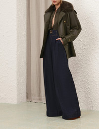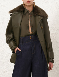 ITEM DETAILS The Hypnotic Leather Short Trench in Olive from our Fall 2025 Collection, Hypnotic. A short leather trench coat featuring a double breasted closure, detachable shearling collar and removable waist belt. - Sheep leather trench coat - Lightly padded shoulders - Buttoned cuffs with tuck detailing - Front welt pockets - Collar can be worn folded down with shearling, or buttoned high without - Fully lined Runway: This style was featured on the F25 Runway. Style Code: 4992JF251 SIZE DETAILS 0P 0 1 2 3 4 Length 19.5 20.5 20.5 21 21.5 22 Bust 47 49.5 51 53.5 55 57.5 Hip 49 51 53 55 56.5 59 Sleeve 29.5 31.5 32 32.5 32.5 33 Designed for a relaxed, oversized fit This garment fits true to size Available in size 0P, suited to clients who are under 5'3"/ 160cm Model is 5'9.5"/178 cm, bust size 32C/10C and wears a size 0 Item measurements are in inches CARE INSTRUCTIONS Main: sheep leather; contrast: sheep shearling; lining: 75% viscose, 25% silk Clean professionally by a specialist leather and suede expert; Do not dry clean; Avoid water; Due to the nature of this garment colour may transfer onto clothing, accessories or furnishings Always check the label or care card for specific care instructions.