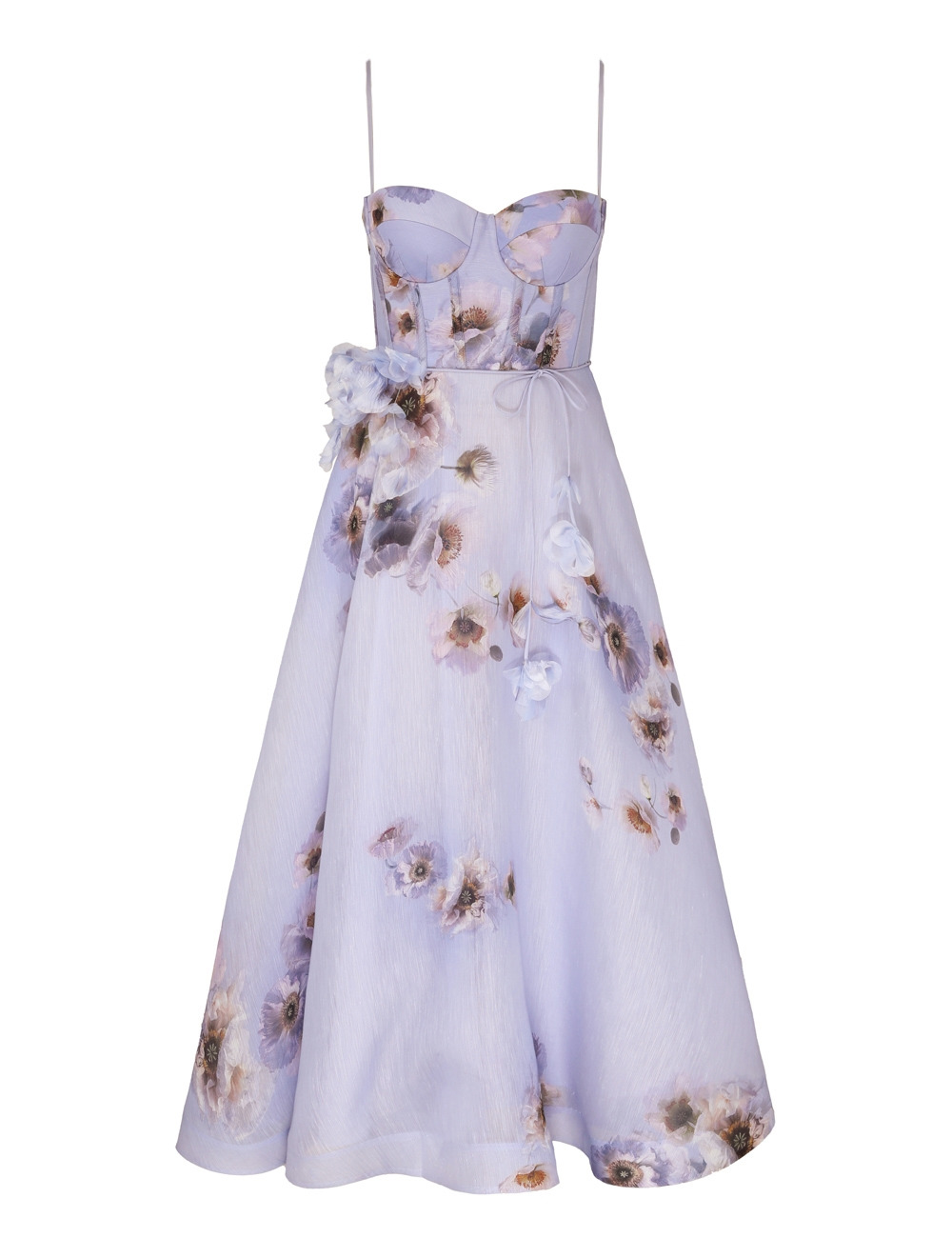 ITEM DETAILS The Hypnotic Picnic Dress in Lilac Poppy from our Fall 2025 Collection, Hypnotic. A silk linen midi dress featuring a sweetheart neckline, a structured bustier bodice and a full flared skirt. - Structured bodice with boning and underwire - Adjustable straps for versatile fit - Removable rouleau belt with flower trim - Shirred back with invisible zip closure - Flared skirt - Side seam pockets Style Code: 5775DF251 SIZE DETAILS 0P 0 1 2 3 4 Length 93 103 103 103 103 103 Waist 62 64 70 76 82 86 Designed to be fitted at the bust and waist, relaxed at hips This garment fits true to size Available in size 0P, suited to clients who are under 5'3"/ 160cm Model is 5'9.5"/178 cm, bust size 32C/10C and wears a size 0 Item measurements have been rounded to the nearest cm CARE INSTRUCTIONS Main: 53% linen, 47% silk; lining: 100% cotton Dry clean only code f (hydrocarbon only); Remove any detachable trims prior to dry cleaning; Cover to protect trim; Cool iron with protective cloth; Light steam only; Do not spot clean Always check the label or care card for specific care instructions.