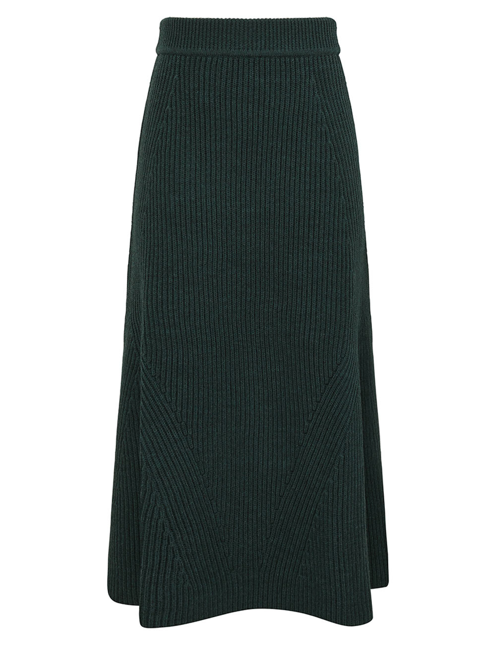 ITEM DETAILS The Hypnotic Rib Midi Skirt in Dark Green from our Fall 2025 Collection, Hypnotic. A ribbed knit midi skirt featuring an elasticated waistband and soft A-line silhouette. - 100% wool - Ribbed knit - Flared hem - Slip on style Style Code: 4889SF251 SIZE DETAILS 0P 0 1 2 3 4 Length 73 80 80 80 80 80 Waist 62 66 70 76 80 86 Hip 82 86 92 98 102 106 Designed with an elasticated waist for a relaxed fit This garment fits true to size Available in size 0P, suited to clients who are under 5'3"/ 160cm Model is 5'9.5"/178 cm, bust size 32C/10C and wears a size 0 Item measurements have been rounded to the nearest cm CARE INSTRUCTIONS 100% wool Dry clean only code f (hydrocarbon only); Remove any detachable trims prior to dry cleaning; Cover to protect trim; Cool iron with protective cloth; Do not spot clean; Store garment flat do not hang Always check the label or care card for specific care instructions.