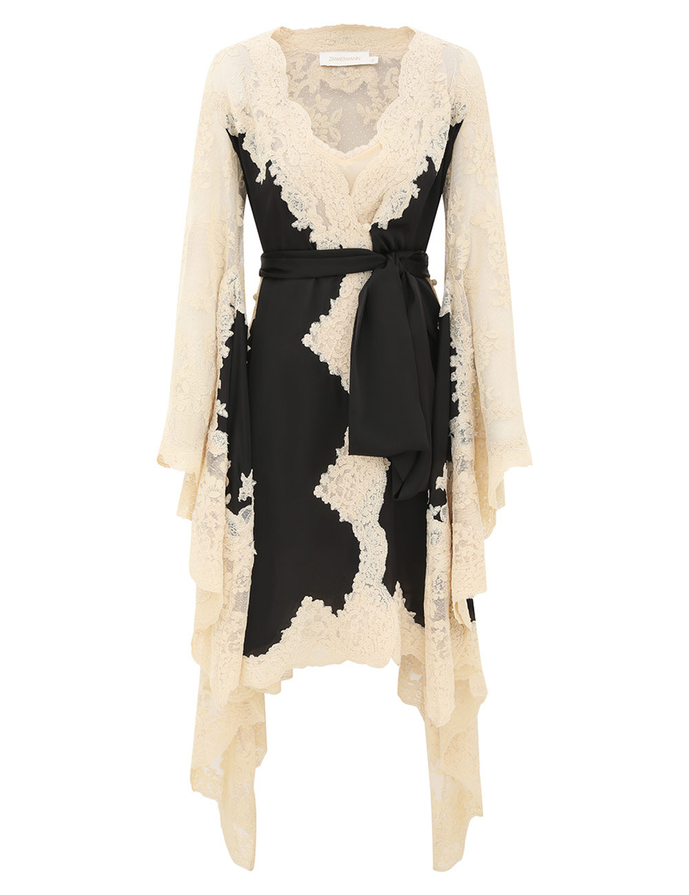 ITEM DETAILS The Hypnotic Satin Wrap Dress in Black from our Fall 2025 Collection, Hypnotic. A silk satin mini dress featuring a wrap silhouette with a fluid asymmetric skirt and plunging neckline. - 100% silk fabric - High lace neckline - Self-tie waist - Long lace sleeves with exaggerated cuffs - Scalloped lace trim detailing throughout - Comes with separate slip Runway: This style was featured on the F25 Runway. Style Code: 5364DF251 SIZE DETAILS 0P 0 1 2 3 4 Length 38.5 40.5 41.5 41.5 41.5 41.5 Bust 34.5 36 38.5 40 42.5 44 Waist 33 34 36 38 40 41.5 Sleeve 22 23.5 23.5 24 24 24.5 Designed to be fitted at the bust, waist, and sleeves This garment fits true to size Available in size 0P, suited to clients who are under 5'3"/ 160cm Model is 5'9.5"/178 cm, bust size 32C/10C and wears a size 0 Item measurements are in inches CARE INSTRUCTIONS Main: 100% silk; lace: 100% polyester; slip: 100% viscose Dry clean only code f (hydrocarbon only); Remove any detachable trims prior to dry cleaning; Cover to protect trim; Do not steam; Cool iron with protective cloth; Do not spot clean Dry clean only code f (hydrocarbon only); Cover to protect trim; Cool iron with protective cloth; Do not spot clean ; Always check the label or care card for specific care instructions.