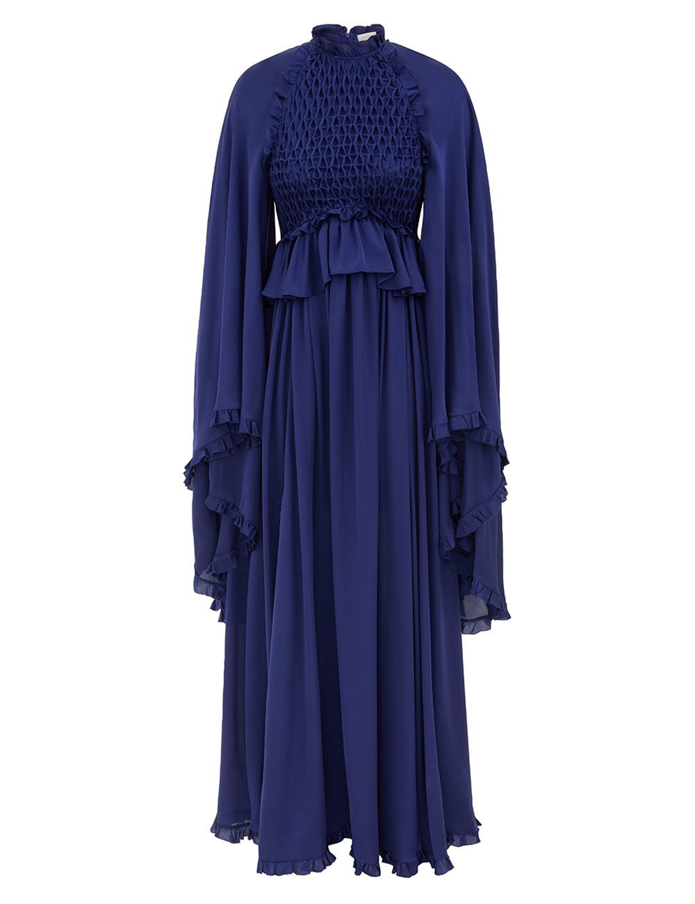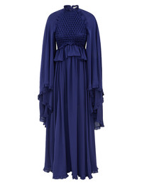 ITEM DETAILS The Hypnotic Smocked Flutter Dress in Royal Blue from our Fall 2025 Collection, Hypnotic. A silk satin maxi dress featuring a smocked bodice, exaggerated long sleeves, and frill detailing throughout. - 100% silk fabric - High neck with frill - Peplum style bodice - Gathered frills along cuffs and hem - Front skirt splits - Invisible zip at centre back Runway: This style was featured on the F25 Runway. Style Code: 6219DF251 SIZE DETAILS 0P 0 1 2 3 4 Length 55.5 60 60.5 60.5 61 61.5 Bust 32.5 34.5 37 38.5 41 42.5 Sleeve 37.5 40.5 41 41.5 41.5 42 Designed to be slightly fitted at the bust and waist, loose at the hip Step into this style when trying it on This garment fits true to size Available in size 0P, suited to clients who are under 5'3"/ 160cm Model is 5'9.5"/178 cm, bust size 32C/10C and wears a size 0 Item measurements are in inches CARE INSTRUCTIONS Main: 100% silk Dry clean only code f (hydrocarbon only); Remove any detachable trims prior to dry cleaning; Cover to protect trim; Cool iron with protective cloth; Light steam only; Do not spot clean Always check the label or care card for specific care instructions.