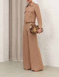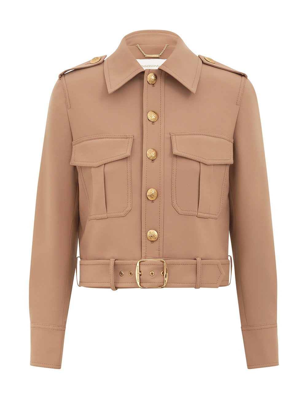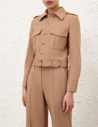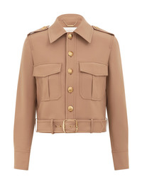 ITEM DETAILS The Hypnotic Stretch Wool Biker in Biscuit from our Fall 2025 Collection, Hypnotic. A cropped wool biker jacket featuring a classic collar, gold buttons down the centre front and a wrap around buckle belt at the waist. - Stretch wool utility jacket - Classic collar - Buttoned front closure and cuffs - Functional front flap pockets - Removable self covered belt - Fully lined Style Code: 4700JF251 SIZE DETAILS 0P 0 1 2 3 4 Length 36 41 42 42 43 44 Bust 88 94 100 104 110 114 Sleeve 46 50 51 52 52 53 Cropped with a relaxed fit This garment fits true to size Available in size 0P, suited to clients who are under 5'3"/ 160cm Model is 5'9.5"/178 cm, bust size 32C/10C and wears a size 0 Item measurements have been rounded to the nearest cm CARE INSTRUCTIONS Main: 98% wool, 2% elastane; lining: 75% viscose, 25% silk Dry clean only code f (hydrocarbon only); Cover to protect trim; Cool iron with protective cloth; Do not spot clean ; Always check the label or care card for specific care instructions.