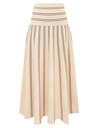 ITEM DETAILS The Hypnotic Stripe Midi Skirt in Cream/Tan from our Fall 2025 Collection, Hypnotic. A knit midi skirt featuring contrast stripes, a thick elasticated waistband and a soft A-line silhouette. - Elasticated, mid-rise waist - Slip on style - Stripe pattern Style Code: 3990SF251 SIZE DETAILS 0P 0 1 2 3 4 Length 30 33 33 33 33 33 Waist 23.5 24.5 27 29 30.5 33 Hip 27 29 31.5 33 35.5 37 Designed with an elasticated waist for a relaxed fit This garment fits true to size Available in size 0P, suited to clients who are under 5'3"/ 160cm Model is 5'9.5"/178 cm, bust size 32C/10C and wears a size 0 Item measurements are in inches CARE INSTRUCTIONS 86% viscose 13% polyamide 1% elastane Dry clean only code f (hydrocarbon only); Remove any detachable trims prior to dry cleaning; Cover to protect trim; Cool iron with protective cloth; Do not spot clean; Store garment flat do not hang Always check the label or care card for specific care instructions.