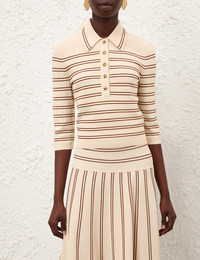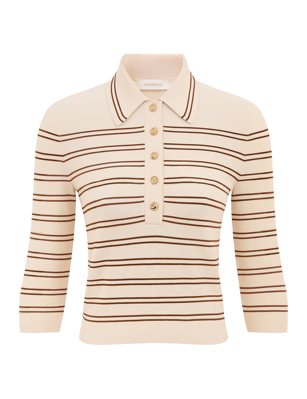 ITEM DETAILS The Hypnotic Stripe Polo in Cream/Tan from our Fall 2025 Collection, Hypnotic. A knit polo top featuring a classic collar and buttons down the top front opening. - Three-quarter length sleeves - Contrast stripes and piping along collar - Gold button detailing at centre front Style Code: 3677TF251 SIZE DETAILS 0P 0 1 2 3 4 Length 17.5 18.5 19 19.5 19.5 19.5 Bust 29 30.5 33 35.5 37 39.5 Sleeve 14 15.5 15.5 16 16 16.5 Designed for a close fit This garment fits true to size Available in size 0P, suited to clients who are under 5'3"/ 160cm Model is 5'9.5"/178 cm, bust size 32C/10C and wears a size 0 Item measurements are in inches CARE INSTRUCTIONS 86% viscose 13% polyamide 1% elastane Dry clean only code f (hydrocarbon only); Remove any detachable trims prior to dry cleaning; Cover to protect trim; Cool iron with protective cloth; Do not spot clean; Store garment flat do not hang Always check the label or care card for specific care instructions.
