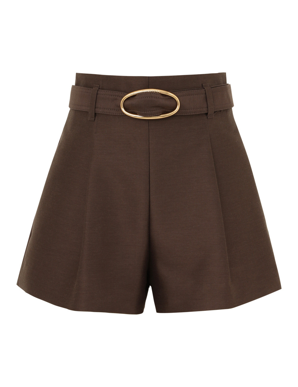 ITEM DETAILS The Hypnotic Tailored Short in Espresso from our Fall 2025 Collection, Hypnotic. A wool silk blend high waisted short featuring side seam pockets and a removable belt. - Wool silk blend short - Side seam pockets - Adjustable and removable belt - Tucks throughout - Welt pockets on back - Invisible zip at centre back Style Code: 2949AF251 SIZE DETAILS 0P 0 1 2 3 4 Length 34 36 37 38 38 39 Waist 68 71 76 81 86 91 Inseam 7 7 7 7 7 7 Fitted through the waist, relaxed through the legs This garment fits true to size Available in size 0P, suited to clients who are under 5'3"/ 160cm Model is 5'9.5"/178 cm, bust size 32C/10C and wears a size 0 Item measurements have been rounded to the nearest cm CARE INSTRUCTIONS Main: 92% wool, 8% silk; lining: 75% viscose, 25% silk Dry clean only code f (hydrocarbon only); Remove any detachable trims prior to dry cleaning; Cover to protect trim; Cool iron with protective cloth; Light steam only; Do not spot clean Always check the label or care card for specific care instructions.