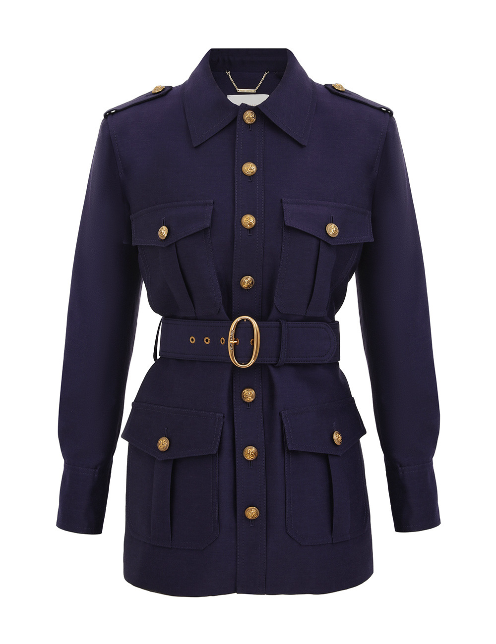 ITEM DETAILS The Hypnotic Utility Jacket in Ink from our Fall 2025 Collection, Hypnotic. A utility jacket featuring a belted waist and gold military-style buttons down the centre front and at the cuffs. - Wool blend jacket - Long sleeves with gathered cuffs - Adjustable, removable buckle belt - Classic collar - Gold buttons at front closure and shoulder tabs - Functional flap pockets throughout - Fully lined Style Code: 4124JF251 SIZE DETAILS 0P 0 1 2 3 4 Length 26.5 28.5 28.5 29 29 29.5 Bust 36 38.5 41 42.5 45 46.5 Waist 36 38 40 41.5 44 46.5 Sleeve 17.5 19.5 19.5 19.5 20 20.5 Tailored with a relaxed fit This garment fits true to size Available in size 0P, suited to clients who are under 5'3"/ 160cm Model is 5'9.5"/178 cm, bust size 32C/10C and wears a size 0 Item measurements are in inches CARE INSTRUCTIONS Main: 92% wool, 8% silk; lining: 75% viscose, 25% silk Dry clean only code f (hydrocarbon only); Remove any detachable trims prior to dry cleaning; Cover to protect trim; Cool iron with protective cloth; Light steam only; Do not spot clean Always check the label or care card for specific care instructions.