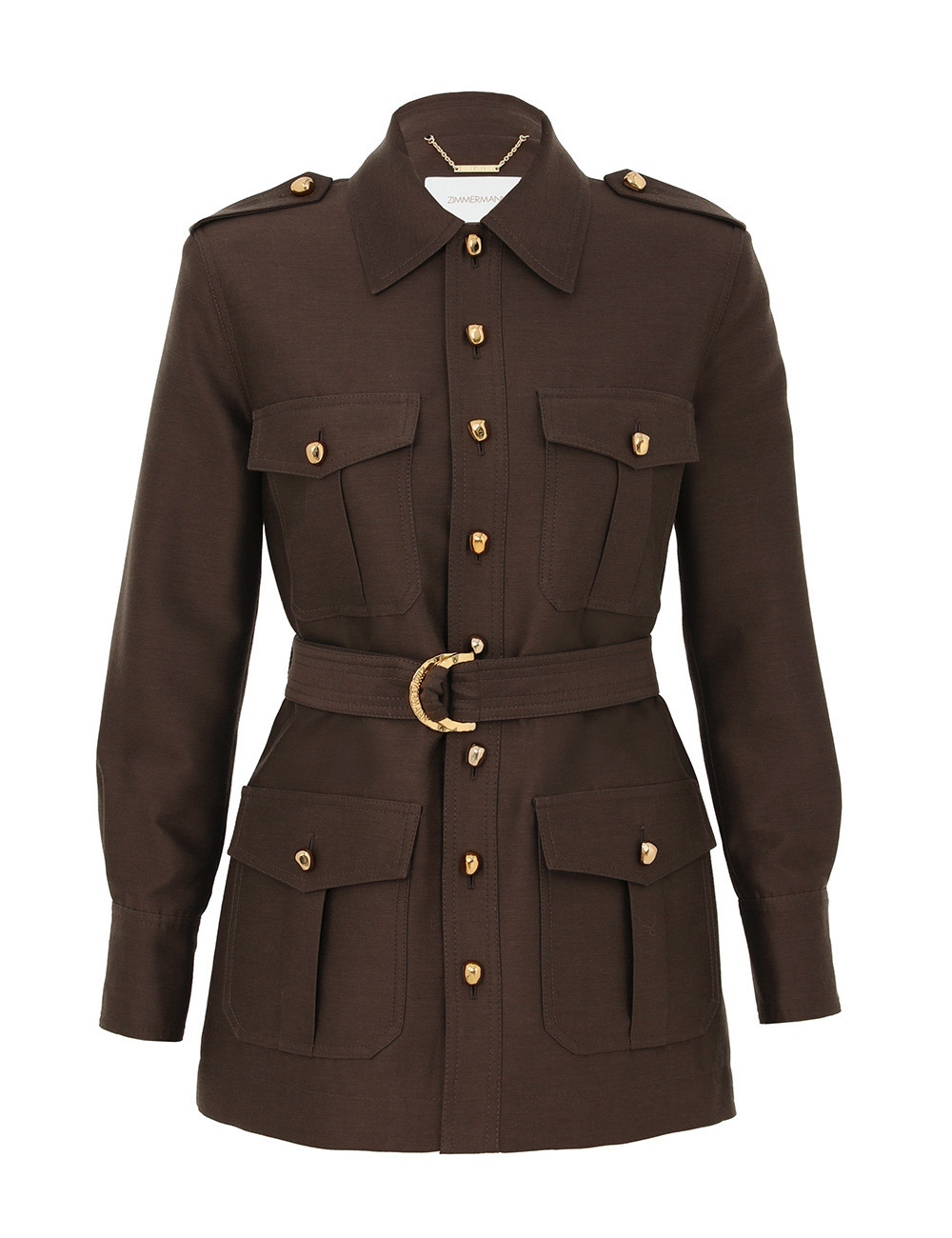 ITEM DETAILS The Hypnotic Utility Jacket in Espresso from our Fall 2025 Collection, Hypnotic. A utility jacket featuring a belted waist and gold military-style buttons down the centre front and at the cuffs. - Wool blend jacket - Long sleeves with gathered cuffs - Adjustable, removable buckle belt - Classic collar - Gold buttons at front closure and shoulder tabs - Functional flap pockets throughout - Fully lined Style Code: 4124JF251 SIZE DETAILS 0P 0 1 2 3 4 Length 67 72 73 74 74 75 Bust 92 98 104 108 114 118 Waist 92 96 102 106 112 118 Sleeve 45 49 50 50 51 52 Tailored with a relaxed fit This garment fits true to size Available in size 0P, suited to clients who are under 5'3"/ 160cm Model is 5'9.5"/178 cm, bust size 32C/10C and wears a size 0 Item measurements have been rounded to the nearest cm CARE INSTRUCTIONS Main: 92% wool, 8% silk; lining: 75% viscose, 25% silk Dry clean only code f (hydrocarbon only); Remove any detachable trims prior to dry cleaning; Cover to protect trim; Cool iron with protective cloth; Light steam only; Do not spot clean Always check the label or care card for specific care instructions.