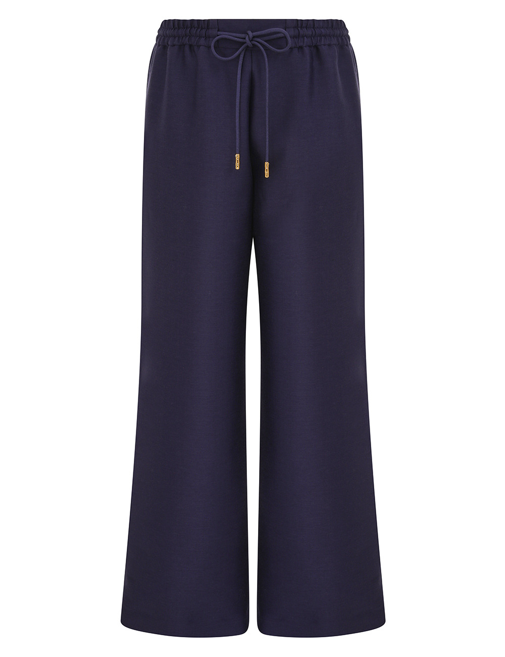 ITEM DETAILS The Hypnotic Utility Track Pant in Ink from our Fall 2025 Collection, Hypnotic. A wide leg pant featuring an elasticated waistband with drawstring and side seam pockets. - Wool blend pant - Mid-rise silhouette - Self-tie drawstring waist - Functional side seam pockets - Back welt pocket on right hand side Style Code: 4688PF251 SIZE DETAILS 0P 0 1 2 3 4 Length 97 107 108 108 109 109 Waist 88 92 98 102 108 112 Hip 96 102 106 112 116 122 Inseam 75 83 83 83 83 83 Designed with an elasticated waist for a relaxed fit Mid-rise waist with a full-length leg This garment fits true to size Available in size 0P, suited to clients who are under 5'3"/ 160cm Model is 5'9.5"/178 cm, bust size 32C/10C and wears a size 0 Item measurements have been rounded to the nearest cm CARE INSTRUCTIONS Main: 92% wool, 8% silk; lining: 75% viscose, 25% silk Dry clean only code f (hydrocarbon only); Cover to protect trim; Cool iron with protective cloth; Do not spot clean ; Always check the label or care card for specific care instructions.