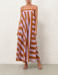 ITEM DETAILS The Indra Stripe Maxi Dress in Lilac Tan from our Summer Swim 2026 Collection. A silk maxi dress featuring a straight neckline, adjustable straps, finished with contrasting stripes throughout and an invisible centre back zip closure. - Silk habutae fabric - Sleeveless, full-length dress - Adjustable straps for versatile fit - Shirred back bodice with invisible zip closure - Gathered throughout Style Code: 9043DSS262 SIZE DETAILS 0P 0 1 2 3 4 Length 110 121 121 121 121 121 Fitted at the bust, relaxed through the skirt This garment fits true to size Available in size 0P, suited to clients who are under 5'3"/ 160cm Model is 5'9.5"/178 cm, bust size 32C/10C and wears a size 0 Item measurements have been rounded to the nearest cm CARE INSTRUCTIONS Main: 100% silk; lining: 100% viscose Dry clean only code f (hydrocarbon only); Remove any detachable trims prior to dry cleaning; Cover to protect trim; Iron in low temperature with protective cloth; Light steam only; Do not spot clean Always check the label or care card for specific care instructions.