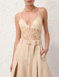 ITEM DETAILS The Lace Teddy in Cream from our Fall 2025 Collection, Hypnotic. A lace bodysuit featuring an invisible centre back zip closure and adjustable straps. - Lace teddy - Organza lining in bust - Invisible centre back zip - Adjustable straps Style Code: 1300TF25R SIZE DETAILS 0P 0 1 2 3 4 Length 55 59 61 63 65 67 Waist 62 67 72 78 82 88 Fitted throughout This garment fits true to size Available in size 0P, suited to clients who are under 5'3"/ 160cm Model is 5'9.5"/178 cm, bust size 32C/10C and wears a size 0 Item measurements have been rounded to the nearest cm CARE INSTRUCTIONS Main: 55% polyamide, 45% cotton; lining 1: 100% viscose; lining 2: 100% silk; trim: 62% cotton, 38% polyamide Dry clean only code f (hydrocarbon only); Remove any detachable trims prior to dry cleaning; Cover to protect trim; Do not steam; Cool iron with protective cloth; Do not spot clean Always check the label or care card for specific care instructions.