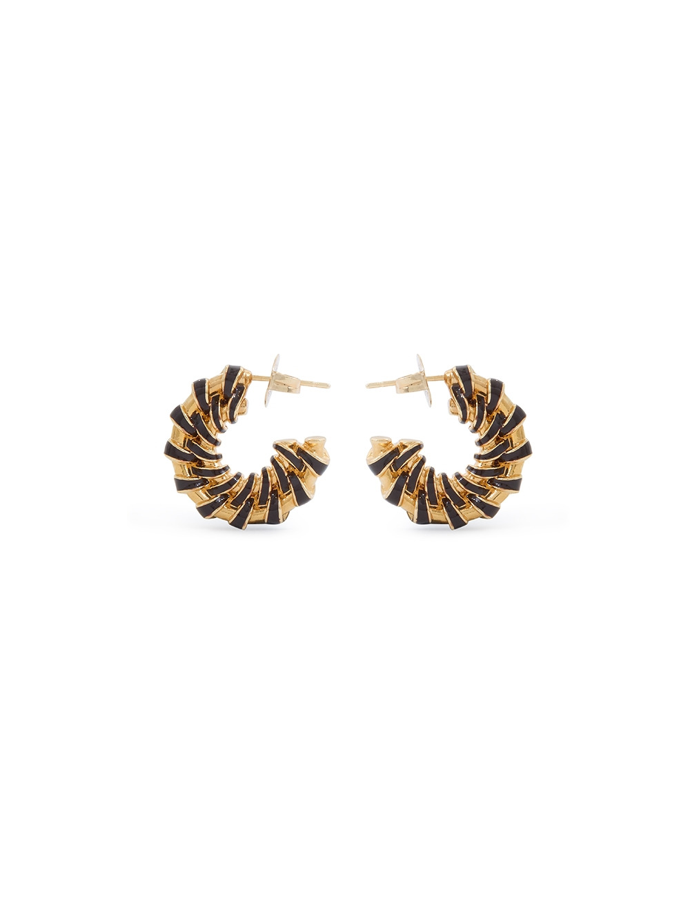 ITEM DETAILS The Loom Mini Hoops in Gold/Burgundy from our Fall 2025 Collection, Hypnotic. A gold plated statement earring featuring twisted brass detailing and a stud post back. - 12KT gold plated brass hoops - Enamel detailing in deep burgundy hues - Stud post back - Sold as a pair Style Code: 5049XF25A1 SIZE DETAILS Suitable for pierced ears. Sold as a pair. CARE INSTRUCTIONS 60% brass 35% enamel 5% stainless steel Zimmermann jewellery is made from 12kt gold-plated brass Please remove during exercise, showering, or swimming Keep enamel pieces away from perfumes, acetones, creams, and water to prevent damage or discoloration Clean with warm water, mild soap, and a soft cloth Store in a cool, dry place, away from sunlight and heat Always check the label or care card for specific care instructions.