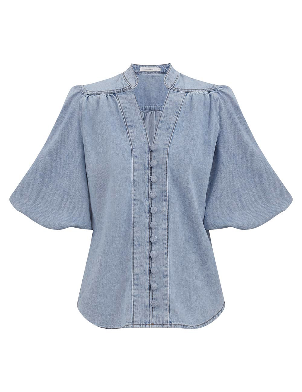 ITEM DETAILS The Lucky Denim Blouse in Skylark from our Summer Swim 2025 Collection. A denim blouse featuring a plunging V-neckline, a stand collar and blouson sleeves with elasticated cuffs, finished with buttons down the centre front. - Denim blouse - Mid-length sleeves with elasticated cuffs - Deep V-neckline - Buttons down the length of the blouse - Removable self covered rope belt Style Code: 2867TSS252 SIZE DETAILS 0P 0 1 2 3 4 Length 23 25 25 25.5 25.5 26 Bust 35.5 38 40 41.5 44 45.5 Sleeve 18 19 19.5 19.5 19.5 20 Designed for a slightly loose fit, with a closer fit at the bust This garment fits true to size Available in size 0P, suited to clients who are under 5'3"/ 160cm Model is 5'9.5"/178 cm, bust size 32C/10C and wears a size 0 Item measurements are in inches CARE INSTRUCTIONS 100% cotton Gentle cold machine wash separately with mild detergent; Remove any detachable trims prior to cleaning Cover to protect trim; Do not soak or bleach; Do not tumble dry; Dry in shade without delay; Cool iron with protective cloth; Do not spot clean; Dry cleanable code p Always check the label or care card for specific care instructions.