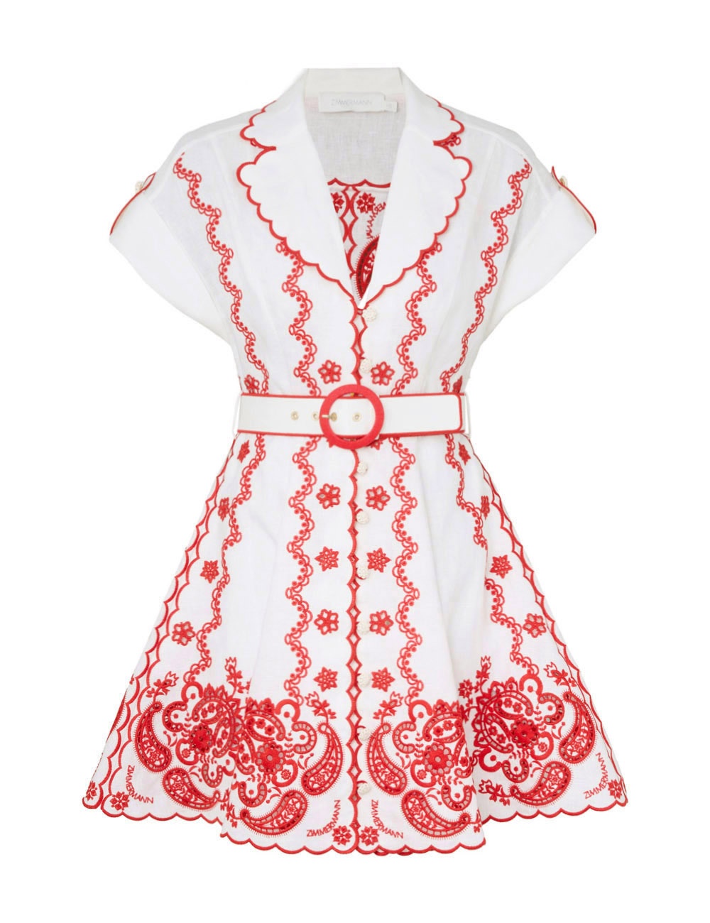 ITEM DETAILS The Lucky Embroidered Mini Dress in Ivory/Red from our Summer Swim 2025 Collection. A linen mini dress featuring a plunging V-neckline, a classic collar with scalloped edging and short folded sleeves, finished with a removable belt at the waist. - 100% linen fabric - Crochet flower buttons down the centre front - Side seam pockets - Scalloped edging along collar and hem - Removable self covered buckle belt - Comes with a separate slip Style Code: 4589DSS252 SIZE DETAILS 0P 0 1 2 3 4 Length 31.5 33.5 34 34.5 34.5 Bust 28.5 30.5 33 34.5 37 Waist 25 27 29 30.5 33 Designed for a loose fit, with a closer fit at the waist This garment fits true to size Available in size 0P, suited to clients who are under 5'3"/ 160cm Model is 5'9.5"/178 cm, bust size 32C/10C and wears a size 0 Item measurements are in inches CARE INSTRUCTIONS Main: 100% linen; embroidery: 100% polyester; lining: 100% cotton; slip: 86% recycled polyester, 14% elastane Dry clean only code f (hydrocarbon only); Remove any detachable trims prior to dry cleaning; Cover to protect trim; Cool iron with protective cloth; Light steam only; Do not spot clean Gentle cold hand wash separately with mild detergent; Remove any detachable trims prior to cleaning; Cover to protect trim; Do not soak, rub or wring; Do not bleach; Dry in shade; Cool iron with protective cloth; Do not tumble dry; Do not spot clean; Dry cleanable code f (hydrocarbon only); Always check the label or care card for specific care instructions.