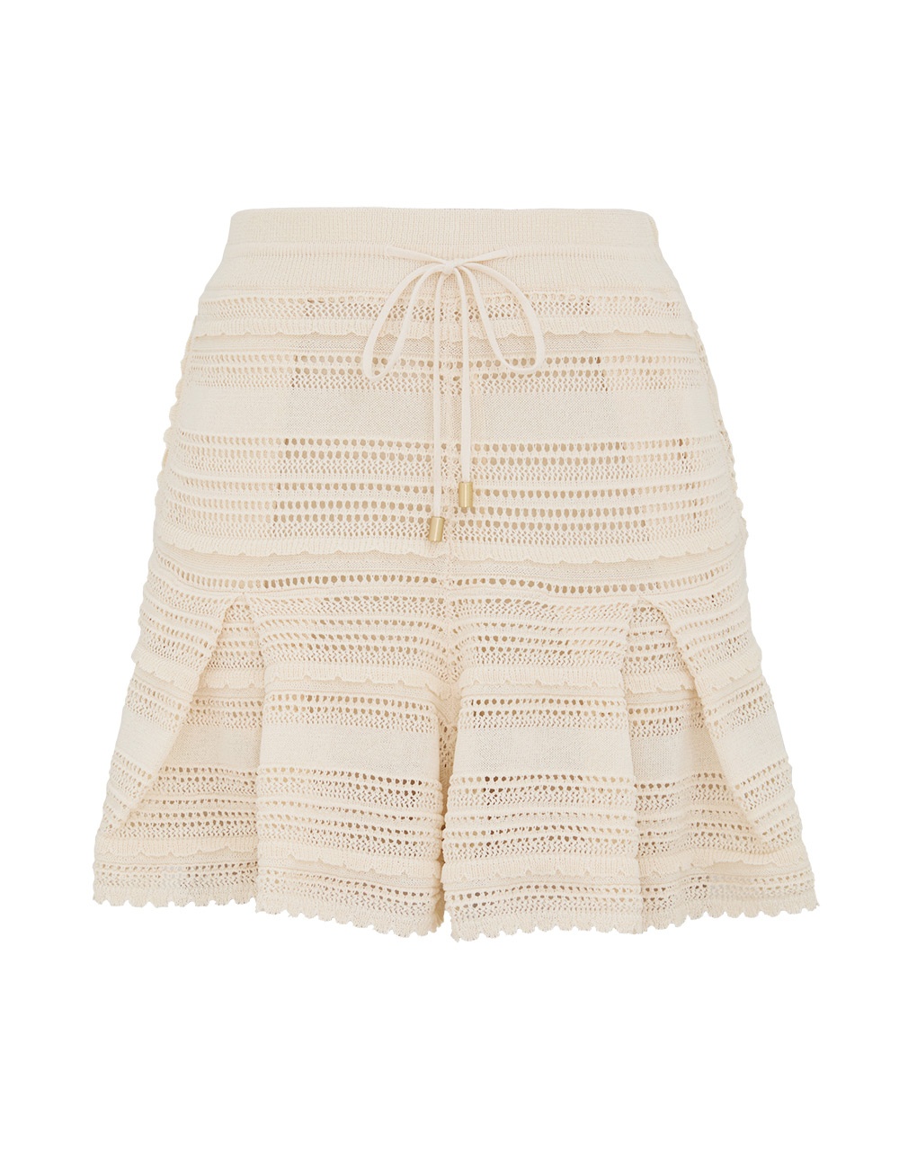 ITEM DETAILS The Lucky Lace Knit Short in Cream from our Summer Swim 2025 Collection. A knit short featuring an elasticated waistband and scalloped trim. - Knit fabric - Drawstring waist with toggle ends - Functional front pockets - Scalloped trim Style Code: 3001ASS252 SIZE DETAILS 0P 0 1 2 3 Length 30 33 34 34 35 Waist 60 62 68 74 78 Hip 88 92 98 104 108 Inseam 7 7 7 7 7 Designed with an elasticated waistband for a flexible fit This garment fits true to size Available in size 0P, suited to clients who are under 5'3"/ 160cm Model is 5'9.5"/178 cm, bust size 32C/10C and wears a size 0 CARE INSTRUCTIONS Main : 58% paper yarn 42% polyester lining : 100% cotton Gentle cold hand wash separately with mild detergent Remove any detachable trims prior to cleaning Cover to protect trim; Do not soak, rub or wring Do not bleach Do not tumble dry Dry flat in shade Cool iron with protective cloth Do not spot clean; Store garment flat do not hang Dry cleanable code f (hydrocarbon only) Always check the label or care card for specific care instructions.