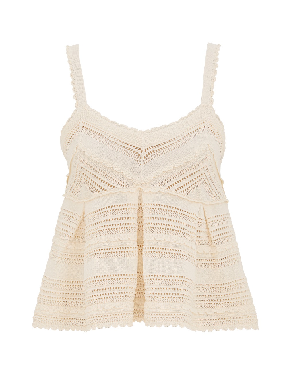 ITEM DETAILS The Lucky Lace Knit Tank in Cream from our Summer Swim 2025 Collection. A knit top featuring a V-neckline and frilled, loose fit hem. - Knit fabric - Cropped length - Scalloped trim - Lace detailing - Loose fit Style Code: 3084TSS252 SIZE DETAILS 0P 0 1 2 3 4 Length 26 28 28 28 28 28 Bust 70 74 80 86 90 96 Designed for a slightly loose fit, with a closer fit at the bust This garment fits true to size Available in size 0P, suited to clients who are under 5'3"/ 160cm Model is 5'9.5"/178 cm, bust size 32C/10C and wears a size 0 CARE INSTRUCTIONS 58% paper yarn 42% polyester Gentle cold hand wash separately with mild detergent Remove any detachable trims prior to cleaning Cover to protect trim; Do not soak, rub or wring Do not bleach Do not tumble dry Dry flat in shade Cool iron with protective cloth Do not spot clean; Store garment flat do not hang Dry cleanable code f (hydrocarbon only) Always check the label or care card for specific care instructions.