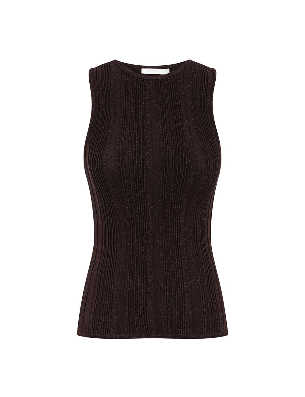ITEM DETAILS The Lucky Metallic Racer Tank in Metallic Chocolate from our Summer Swim 2025 Collection. A knit tank with a high neckline at the front and back. - Slim fit tank - Metallic finish - Racer neckline Style Code: 4314TSS252 SIZE DETAILS 0P 0 1 2 3 Length 19.5 20.5 21 21.5 21.5 Bust 19 21.5 23 25 27 Waist 17.5 19.5 21.5 23.5 25 Designed to fit close to the body This garment fits true to size Available in size 0P, suited to clients who are under 5'3"/ 160cm Model is 5'9.5"/178 cm, bust size 32C/10C and wears a size 0 Item measurements are in inches CARE INSTRUCTIONS 68% viscose 22% polyamide 8% metallized fibre 2% elastane Gentle cold hand wash separately with mild detergent Remove any detachable trims prior to cleaning Cover to protect trim; Do not soak, rub or wring Do not bleach Do not tumble dry Dry flat in shade Cool iron with protective cloth Do not spot clean; Store garment flat do not hang Dry cleanable code f (hydrocarbon only) Always check the label or care card for specific care instructions.