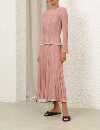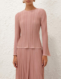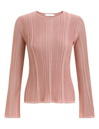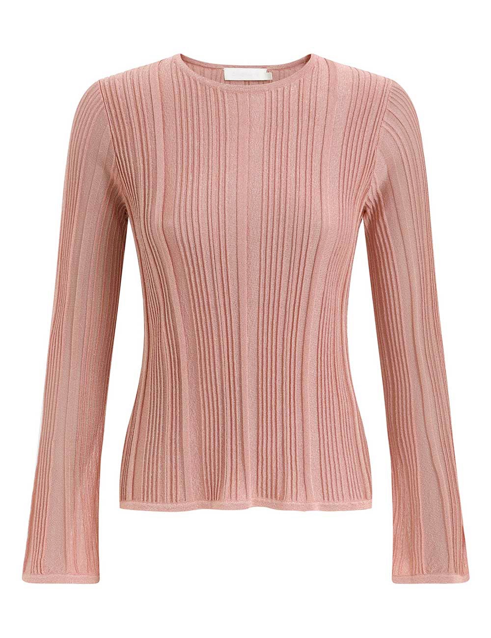 ITEM DETAILS The Lucky Metallic Top in Metallic Pink from our Summer Swim 2025 Collection. A knit top featuring a rounded neckline and a metallic finish. - Slim fit knit top - Long, wide sleeves with bell cuffs - Metallic detail Style Code: 4316TSS252 SIZE DETAILS 0P 0 1 2 3 4 Length 20 21.5 21.5 22.5 22.5 22.5 Bust 28.5 30.5 32.5 34.5 36 38.5 Waist 27 29 30.5 33 34.5 37 Sleeve 41 44 45 45 45.5 46.5 Designed to fit close to the body This garment fits true to size Available in size 0P, suited to clients who are under 5'3"/ 160cm Model is 5'9.5"/178 cm, bust size 32C/10C and wears a size 0 Item measurements are in inches CARE INSTRUCTIONS 89% viscose 11% metallized fibre Gentle cold hand wash separately with mild detergent Remove any detachable trims prior to cleaning Cover to protect trim; Do not soak, rub or wring Do not bleach Do not tumble dry Dry flat in shade Cool iron with protective cloth Do not spot clean; Store garment flat do not hang Dry cleanable code f (hydrocarbon only) Always check the label or care card for specific care instructions.