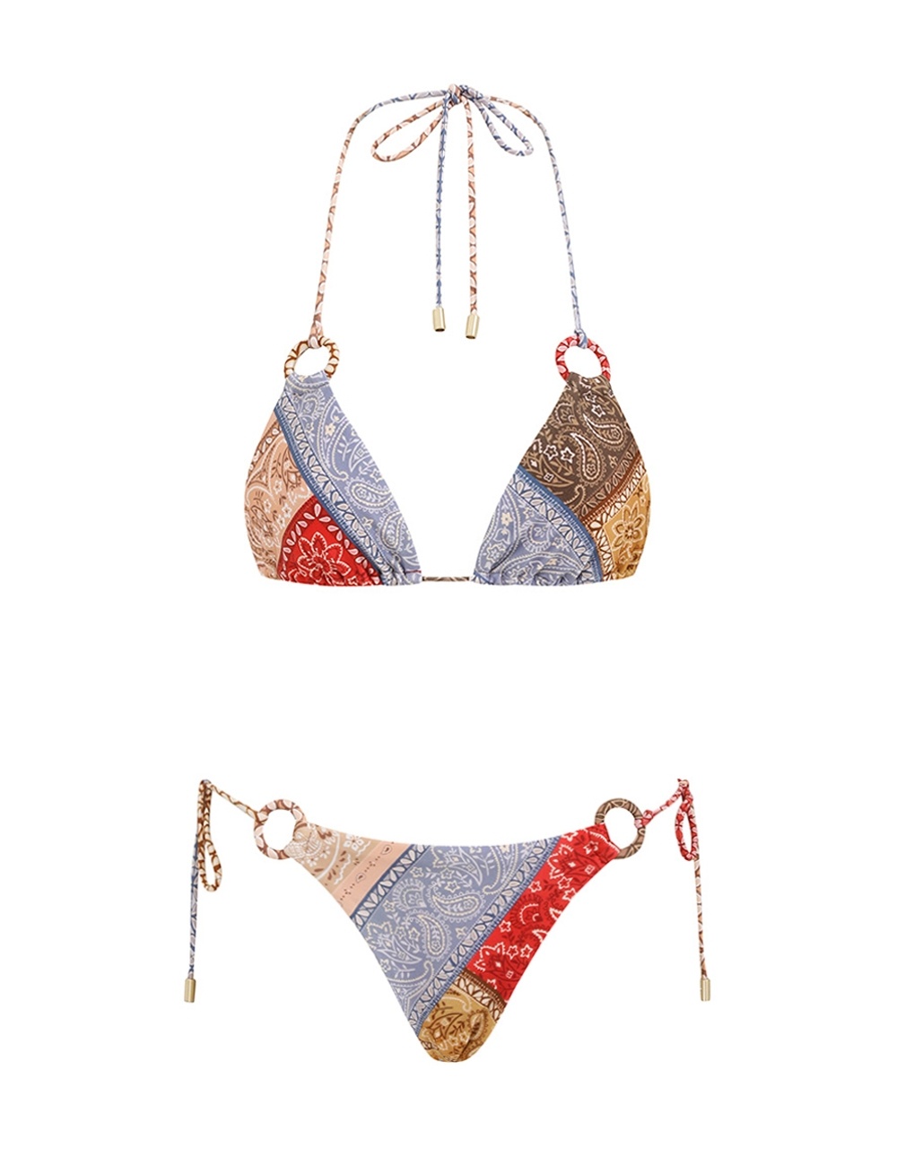 ITEM DETAILS The Lucky Ring Tie Bikini in Spliced from our Summer Swim 2025 Collection. A triangle bikini top and low rise, skinny pant featuring rings throughout and self tie straps with toggle ends. - Lycra bikini set - Low rise skinny pant - Rings attached to self tie straps - Lined Style Code: 4621WSS252 SIZE DETAILS This garment fits true to size Model is 5'10.5"/179 cm, bust size 34C/12C and wears a size 0 CARE INSTRUCTIONS Main: 80% polyamide, 20% elastane, lining: 92% polyamide, 8% elastane Do not roll up when wet; Rinse thoroughly after use; Remove any detachable trims prior to washing; Cold hand wash separately with mild detergent, avoid fabric softener; Dry in shade; Do not bleach or iron; Do not tumble dry; Do not dry clean; Light colours may be transparent when wet; Avoid contact with sunscreens, oils and rough surfaces; Avoid high temperature pools and spas treated with harsh chemicals Always check the label or care card for specific care instructions.