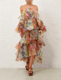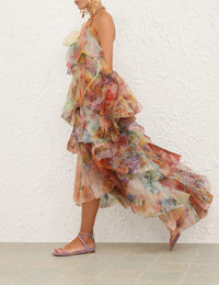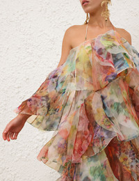 ITEM DETAILS The Luna Fanned Maxi Dress in Spliced Floral from our Spring 2026 Collection, Kindred Spirit. A maxi gown featuring an asymmetric neckline, invisible zip closure and tiered ruffles throughout. - Backless maxi dress - Rouleau halter strap with adjustable chain - Off-the-shoulder billow sleeves - Cascading ruffles throughout - Invisible zip at centre back - High-low hem - Semi-lined Style Code: 8163DS261 SIZE DETAILS 0P 0 1 2 3 4 Length 38 41 41 41 41 41 Waist 32.5 34.5 36 38.5 40 42.5 Adjustable neck chain for flexible fit Light-weight, non-stretchy fabric This garment fits true to size Available in size 0P, suited to clients who are under 5'3"/ 160cm Model is 5'9.5"/178 cm, bust size 32C/10C and wears a size 0 Item measurements are in inches CARE INSTRUCTIONS Main: 100% polyester; lining: 100% viscose; crinoline: 100% polyester Dry clean only code f (hydrocarbon only); Remove any detachable trims prior to dry cleaning; Cover to protect trim; Iron in low temperature with protective cloth; Light steam only; Do not spot clean Always check the label or care card for specific care instructions.