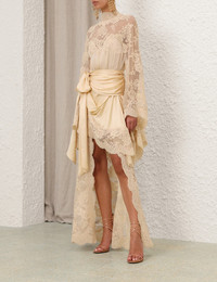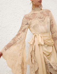 ITEM DETAILS The Luna Satin Drape Dress in Tea from our Spring 2026 Collection, Kindred Spirit. A silk satin midi dress featuring layers of draped silk, an exaggerated sleeve cuff, and a lace skirt. - 100% silk fabric - High lace neckline - Exposed back detail - Self-tie waist - High-low skirt hem - Invisible zip and button closure at centre back Style Code: 5178DS261 SIZE DETAILS 0P 0 1 2 3 4 Length 138 150 151 151 152 153 Bust 88 92 98 102 108 112 Waist 66 68 74 78 84 88 Sleeve 57 61 62 62 63 63 Fitted at the bust, waist, and sleeves This garment fits true to size Available in size 0P, suited to clients who are under 5'3"/ 160cm Model is 5'9.5"/178 cm, bust size 32C/10C and wears a size 0 Item measurements have been rounded to the nearest cm CARE INSTRUCTIONS Main: 100% silk; lace: 100% polyester Dry clean only code f (hydrocarbon only); Remove any detachable trims prior to dry cleaning; Cover to protect trim; Do not steam; Cool iron with protective cloth; Do not spot clean Always check the label or care card for specific care instructions.
