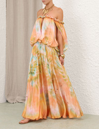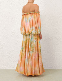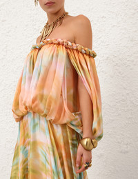 ITEM DETAILS The Luna Twist Billow Gown in Coral Tie Dye from our Spring 2026 Collection, Kindred Spirit. A silk maxi gown featuring a plunging V-neckline, off-the-shoulder billow sleeves, finished with an invisible side zip and drop waist silhouette. - Silk satin chiffon fabric - Braided trim detailing - Elasticated sleeves with slits - Invisible left-side zip - Elasticated waist detailing - Lined skirt Style Code: 8693DS261 SIZE DETAILS 0P 0 1 2 3 4 Length 44.5 49 49 49 49 49 Bust 26 28.5 30 32.5 34 36 Relaxed fit Light-weight, non-stretchy fabric This garment fits true to size Available in size 0P, suited to clients who are under 5'3"/ 160cm Model is 5'9.5"/178 cm, bust size 32C/10C and wears a size 0 Item measurements are in inches CARE INSTRUCTIONS Main: 100% silk; skirt lining: 100% viscose Dry clean only code f (hydrocarbon only); Remove any detachable trims prior to dry cleaning; Cover to protect trim; Iron in low temperature with protective cloth; Light steam only; Do not spot clean Always check the label or care card for specific care instructions.