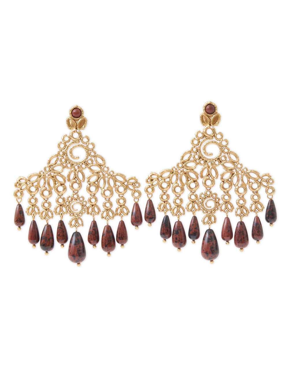 ITEM DETAILS The Maisie Chandeliers in Antique Gold from our Fall 2025 Collection, Hypnotic. A gold plated statement earring featuring natural Mahogany Obsidian stones and a stud post back. - 14KT gold plated brass - Chandelier drop earrings - Natural Mahogany Obsidian stones - Custom plating standard with raw brass castings finish - Stud post back - Sold as a pair Style Code: 5042XF25A1 SIZE DETAILS Suitable for pierced ears. Sold as a pair. CARE INSTRUCTIONS 70% brass 25% mahogany obsidian 5% stainless steel Our semi-precious stones are hand-cut to enhance their natural beauty, with unique variations in each piece Zimmermann jewellery is made from 16kt gold-plated brass Please remove during exercise, showering, or swimming Keep away from perfumes, acetones, creams, and water to prevent damage or discoloration Clean gently with a soft, lint-free clothavoid cleaning products Store in a cool, dry place, away from direct sunlight and heat Always check the label or care card for specific care instructions.
