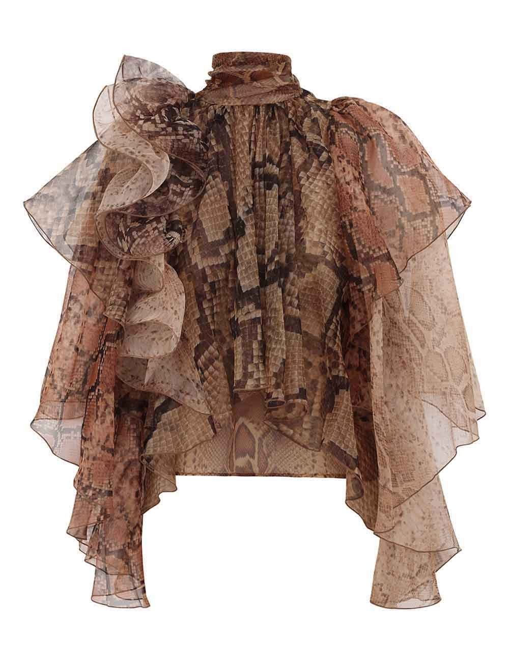 ITEM DETAILS The Memento Billow Blouse in Spliced Snake from our Fall 2025 Collection, Hypnotic. A silk blouse featuring a stand collar and cascading ruffles throughout. - 100% silk fabric - Long sleeves with cascading cuffs - Necktie tied at centre back - Exaggerated ruffle detailing throughout - Invisible zip closures at centre back and left side - Heavily gathered - Asymmetrical hem Runway: This style was featured on the F25 Runway. Style Code: 5238TF252 SIZE DETAILS 0P 0 1 2 3 4 Length 27.5 29 29 29.5 29.5 30 Sleeve 16.5 18 18.5 18.5 19 19 Designed for a relaxed, oversized fit This garment fits true to size Available in size 0P, suited to clients who are under 5'3"/ 160cm Model is 5'9.5"/178 cm, bust size 32C/10C and wears a size 0 Item measurements are in inches CARE INSTRUCTIONS Main: 100% silk Dry clean only code f (hydrocarbon only); Remove any detachable trims prior to dry cleaning; Cover to protect trim; Cool iron with protective cloth; Light steam only; Do not spot clean Always check the label or care card for specific care instructions.