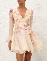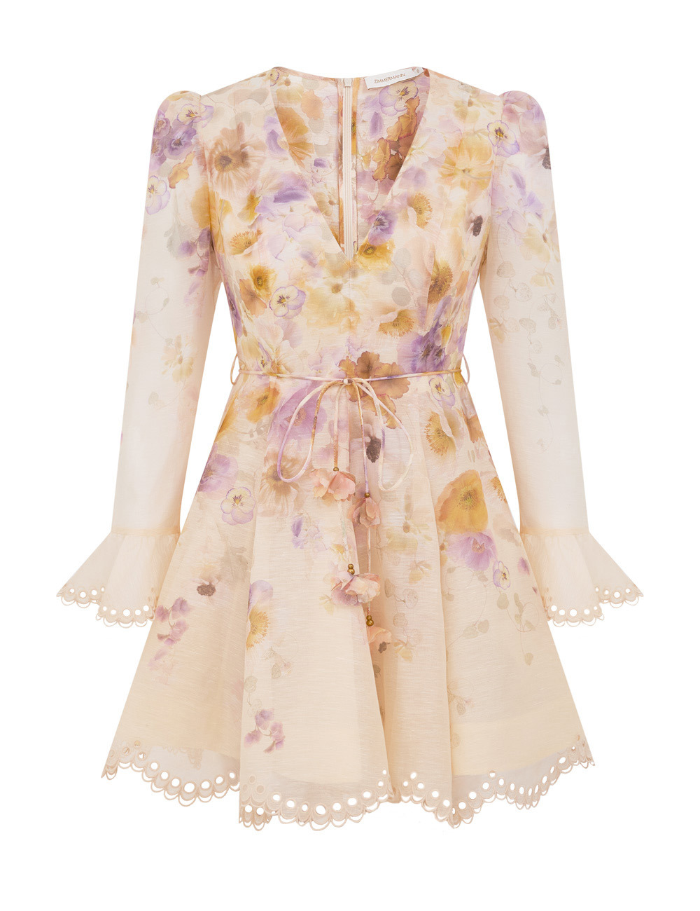 ITEM DETAILS The Memento Embroidered Mini Dress in Pansy Floral from our Fall 2025 Collection, Hypnotic. A silk linen mini dress featuring a plunging V-neckline, removable waist belt and a full skirt with scalloped trim. - Silk linen mini dress - V-neckline - Long sleeves with puffed shoulders - Invisible zip closure at centre back - Rouleau belt at waist with flower detailing - Scalloped edges - Lined skirt Style Code: 4693DF252 SIZE DETAILS 0P 0 1 2 3 4 Length 30.5 32.5 33 33.5 34.5 35 Bust 32.5 34.5 36 38.5 40 42.5 Waist 26 27.5 30 31.5 34 35.5 Sleeve 19.5 21 21.5 21.5 21.5 22 Fitted at the bust, waist and sleeves, relaxed through the hips This garment fits true to size Available in size 0P, suited to clients who are under 5'3"/ 160cm Model is 5'9.5"/178 cm, bust size 32C/10C and wears a size 0 Item measurements are in inches CARE INSTRUCTIONS Main: 53% linen, 47% silk; lining: 100% cotton Dry clean only code f (hydrocarbon only); Remove any detachable trims prior to dry cleaning; Cover to protect trim; Cool iron with protective cloth; Light steam only; Do not spot clean Always check the label or care card for specific care instructions.