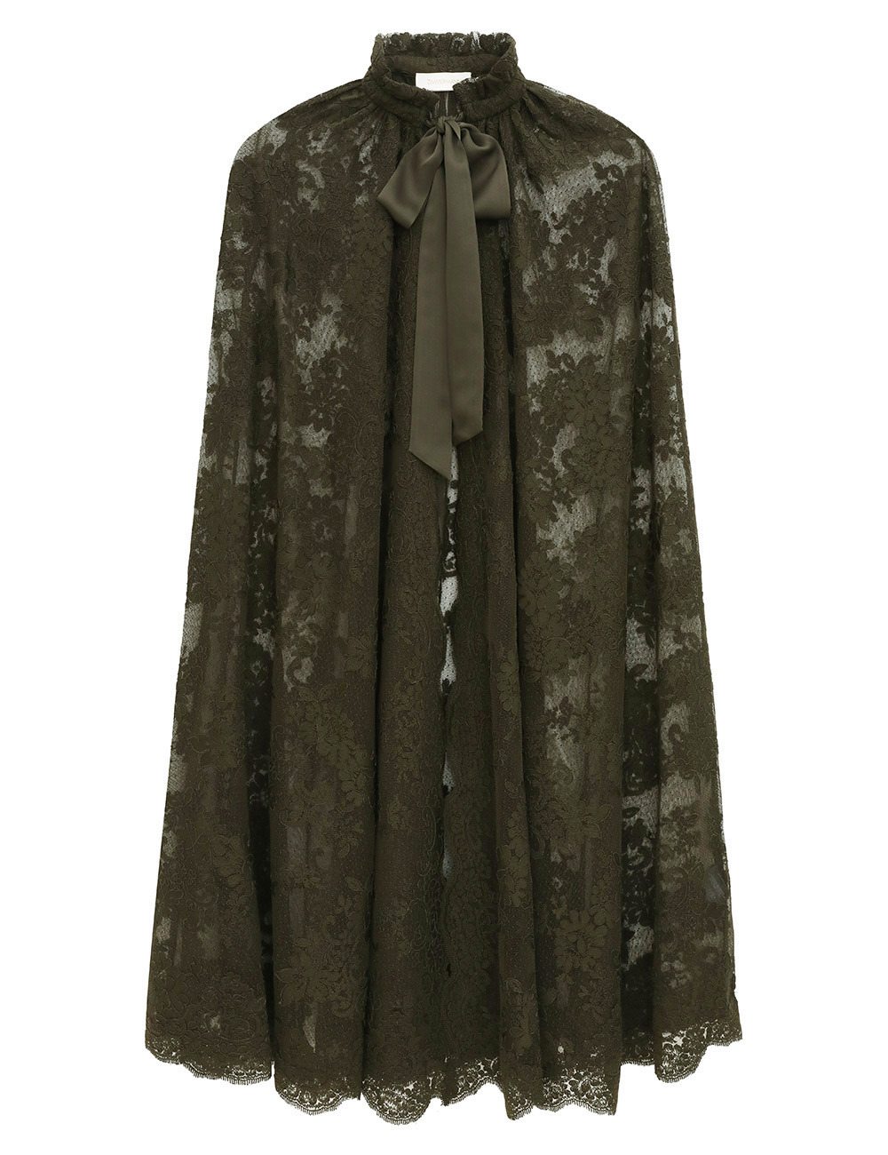 ITEM DETAILS The Memento Lace Cape in Olive from our Fall 2025 Collection, Hypnotic. A lace cape featuring a shirred stand collar with self-tie neck scarf and heavy gathering throughout. - Long sleeve cape with lace detailing - Shirred collar with frill and necktie - Scalloped lace trim - Heavily gathered Runway: This style was featured on the F25 Runway. Style Code: 6299TF252 SIZE DETAILS 0P 0 1 2 3 4 Length 42 45.5 45.5 45.5 46 46.5 Designed for a relaxed fit This garment fits true to size Available in size 0P, suited to clients who are under 5'3"/ 160cm Model is 5'9.5"/178 cm, bust size 32C/10C and wears a size 0 Item measurements are in inches CARE INSTRUCTIONS Main: 100% polyester Dry clean only code f (hydrocarbon only); Remove any detachable trims prior to dry cleaning; Cover to protect trim; Do not steam; Cool iron with protective cloth; Do not spot clean Always check the label or care card for specific care instructions.