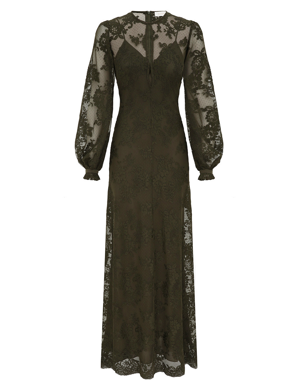 ITEM DETAILS The Memento Lace Maxi Dress in Olive from our Fall 2025 Collection, Hypnotic. A lace maxi gown featuring long blouson sleeves, rounded neckline and keyhole detailing across the bust. - Lace maxi-length dress - Long sleeves with buttoned cuffs - Keyhole cutout at bodice with rouleau loop and button - Invisible zip closure at centre back - Scalloped lace trim at hem - Comes with a separate slip Runway: This style was featured on the F25 Runway. Style Code: 6156DF252 SIZE DETAILS 0P 0 1 2 3 4 Length 54.5 59.5 60 60 60 60.5 Bust 31.5 34 36 38 40 41.5 Waist 28.5 30 31.5 34 35.5 38 Hip 38 40 41.5 44 45.5 48 Sleeve 25 27 27 27 27 27 Slightly fitted at the bust and waist, loose at the hip This garment fits true to size Available in size 0P, suited to clients who are under 5'3"/ 160cm Model is 5'9.5"/178 cm, bust size 32C/10C and wears a size 0 Item measurements are in inches CARE INSTRUCTIONS Main: 100% polyester; slip: 100% silk Dry clean only code f (hydrocarbon only); Remove any detachable trims prior to dry cleaning; Cover to protect trim; Do not steam; Cool iron with protective cloth; Do not spot clean Dry clean only code f (hydrocarbon only); Cover to protect trim; Cool iron with protective cloth; Do not spot clean ; Always check the label or care card for specific care instructions.