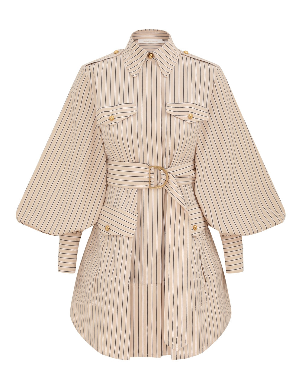 ITEM DETAILS The Memento Utility Mini Dress in Almond Stripe from our Fall 2025 Collection, Hypnotic. A mini dress featuring a concealed placket with buttons down the center front, long blouson sleeves with tucks at the sleeve hem and elongated cuffs, finished with a removable self covered belt. - Utility silhouette mini dress - Flap pockets at the chest and hips - Removable self covered belt - Elongated, fitted cuffs with button closures - Classic collar Style Code: 5189DF252 SIZE DETAILS 0P 0 1 2 3 4 Length 30.5 32.5 33 33.5 34.5 35 Bust 34 36 38 40 41.5 44 Waist 27.5 28.5 30.5 32.5 34.5 36 Sleeve 22.5 24 24.5 24.5 25 25 Designed for a tailored fit This garment fits true to size Available in size 0P, suited to clients who are under 5'3"/ 160cm Model is 5'9.5"/178 cm, bust size 32C/10C and wears a size 0 Item measurements are in inches CARE INSTRUCTIONS Main: 52% polyester, 48% cotton Dry clean only code f (hydrocarbon only); Remove any detachable trims prior to dry cleaning; Cover to protect trim; Cool iron with protective cloth; Light steam only; Do not spot clean Always check the label or care card for specific care instructions.