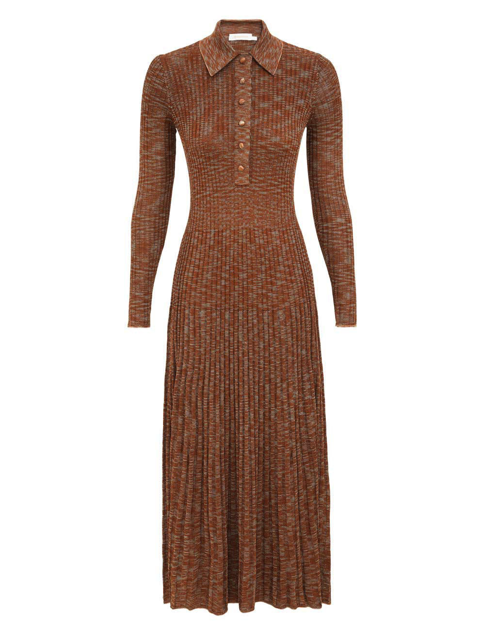 ITEM DETAILS The Mouline Midi Dress in Chocolate Multi from our Fall 2025 Collection, Hypnotic. A knit midi dress featuring a classic collar, buttons down the centre front bodice and an all-over ribbed texture. - Knit mid-length dress - Long fitted sleeves - Classic collar - Button-down front bodice - Pleated skirt - Ribbed texture throughout Style Code: 4864DF25R SIZE DETAILS 0P 0 1 2 3 4 Length 113 124 125 126 126 127 Bust 62 66 72 78 84 88 Waist 54 58 64 70 76 80 Sleeve 56 60 61 61 62 62 Hip 90 94 100 86 112 116 Designed for a close fit at the bodice, with a relaxed fit through the legs This garment fits true to size Available in size 0P, suited to clients who are under 5'3"/ 160cm Model is 5'9.5"/178 cm, bust size 32C/10C and wears a size 0 Item measurements have been rounded to the nearest cm CARE INSTRUCTIONS 100% viscose Dry clean only code f (hydrocarbon only); Remove any detachable trims prior to dry cleaning; Cover to protect trim; Cool iron with protective cloth; Do not spot clean; Store garment flat do not hang Always check the label or care card for specific care instructions.