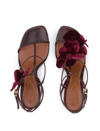ITEM DETAILS The Orchid Sandal 85 in Ruby from our Cruise 2026 Collection, Twisted Romance. A heeled sandal featuring an asymmetric orchid flower design and gold buckle hardware. - Leather stiletto sandal - Velvet orchid and leather outsole - Square toe - Asymmetric fixed orchid design - Ankle strap with gold buckle hardware - 85mm stiletto heel - Made in Italy Style Code: 6326FC26A1 SIZE DETAILS This shoe fits true to size. CARE INSTRUCTIONS Upper: calf leather; contrast: 65% viscose, 35% cupro; lining: sheep leather; outsole: calf leather Patent leather care The high gloss of patent leather may reduce over time To remove scuffs, use a soft pencil eraser, and clean with soapy water and a microfiber cloth Avoid harsh chemicals and direct sunlight Store in the original dust bag, away from heat, never in plastic bag Velvet care This premium velvet item may discolor or stain if exposed to humidity or atmospheric agents Clean with a soft, dry cloth, and if wet, dry immediately with a soft cloth To keep it in optimal condition, avoid exposure to light, heat, water, oils, perfumes, and cosmetics Protect the velvet pile from sharp edges Store in a dry environment in the original dust bag Always check the label or care card for specific care instructions.