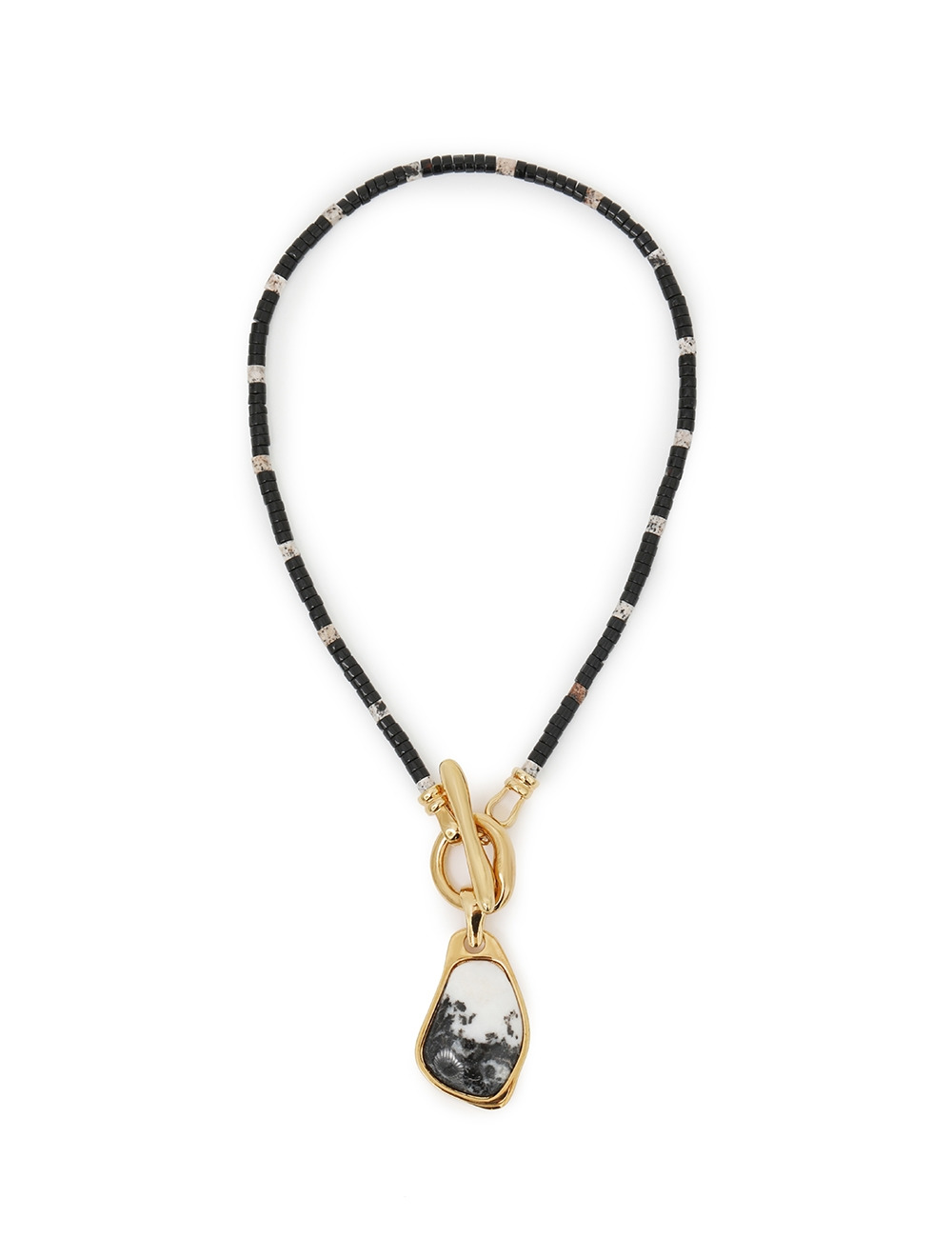 ITEM DETAILS The Ore Pendant in Gold/Black from our Spring 2025 Collection, Illumination. A beaded necklace featuring a custom cut Dalmation Jasper stone set in 24kt gold plating with a beaded chain and metallic gold accents. - Dalmation Jasper stone - 12KT gold plated stone enclosure - Organic shape pendant - T-bar clasp Style Code: 3800XS25A1 SIZE DETAILS CARE INSTRUCTIONS 55% obsidian 30% brass 15% dalmation jasper Our semi-precious stones are hand-cut to enhance their natural beauty, with unique variations in each piece. A zimmermann jewellery is made from 12kt gold-plated brass. A please remove during exercise, showering, or swimming. A keep away from perfumes, acetones, creams, and water to prevent damage or discoloration. A clean gently with a soft, lint-free clothaavoid cleaning products. A store in a cool, dry place, away from direct sunlight and heat.