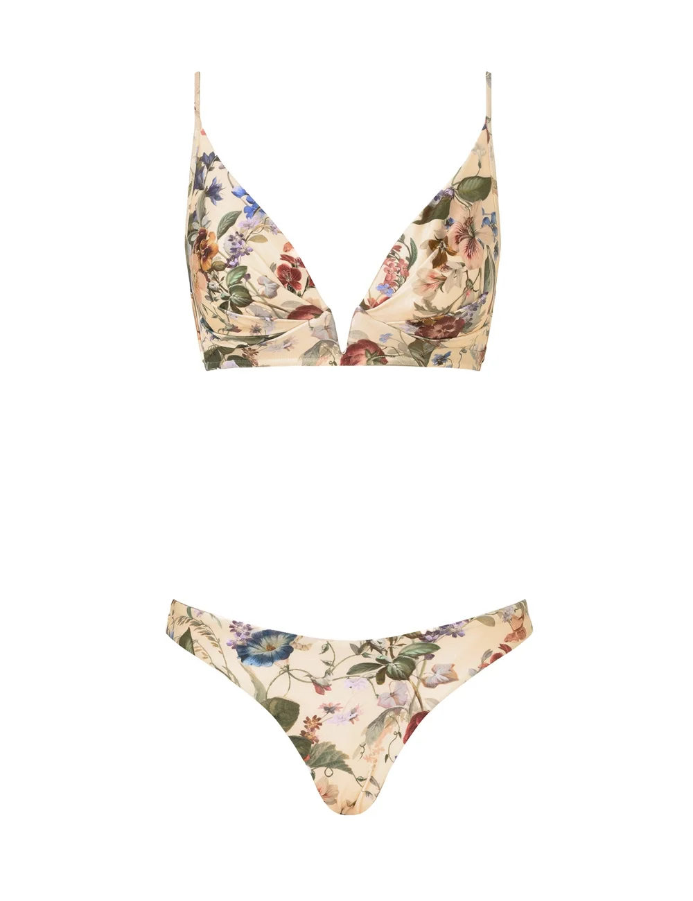ITEM DETAILS The Patience Tuck Plunge Bikini in Vanilla Floral from our Resort Swim 2026 Collection. A shiny plunging V-neck bikini set featuring a ruched bust, adjustable straps and matching brief coverage bottoms. - Shiny bikini set - V-wire top - Gathered bust with boning and underwire - Signature back clasp closure - Classic pant with brief coverage - Removable soft cups - Fully lined Style Code: 5252WRS264 SIZE DETAILS This garment fits true to size Model is 5'10.5"/179 cm, bust size 34C/12C and wears a size 0 CARE INSTRUCTIONS Main: 80% polyamide, 20% elastane; lining: 92% recycled nylon, 8% elastane Do not roll up when wet; Rinse immediately after use; Remove any detachable trims prior to washing; Cold hand wash separately with mild detergent, avoid fabric softener; Dry in shade; Do not bleach or iron; Do not tumble dry; Do not dry clean; Light colours may be transparent when wet; Avoid contact with sunscreens, oils, rough surfaces, and high temperature pools and spas; Always check the label or care card for specific care instructions.