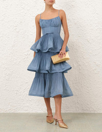 ITEM DETAILS The Pleated Tiered Midi Dress in Deep Blue from our Cruise 2026 Collection, Twisted Romance. A midi-length dress featuring a scoop neckline, adjustable straps, finished with a corset bodice and tiered pleats throughout. - Structured bodice with internal boning - Ruching across bust - Shirred elastic at back bodice - Invisible zip closure at centre back - Cascading frills throughout skirt - Removable belt - Lined Style Code: 6354DC26R SIZE DETAILS 0P 0 1 2 3 4 Length 36 39.5 39.5 39.5 39.5 39.5 Bust 27.5 29 31.5 34 35.5 38 Waist 24.5 26 28.5 30 32.5 34 Fitted bodice, relaxed through the hips Due to the boning structure, the bodice may feel restrictive This garment fits true to size Available in size 0P, suited to clients who are under 5'3"/ 160cm Model is 5'9.5"/178 cm, bust size 32C/10C and wears a size 0 Item measurements are in inches CARE INSTRUCTIONS Main: 100% polyester; lining: 100% cotton Dry clean only code f (hydrocarbon only); Remove any detachable trims prior to dry cleaning; Cover to protect trim; Do not iron; Do not steam; Do not spot clean Always check the label or care card for specific care instructions.