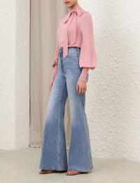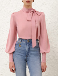 ITEM DETAILS The Pussybow Sweater in Rose from our Fall 2025 Collection, Hypnotic. A wool sweater featuring a stand collar with pussybow necktie and long blouson sleeves with elongated ribbed cuffs. - 100% wool - Ribbed collar, cuffs and hem - Self-tie necktie - Slip on style Style Code: 4885TF25R SIZE DETAILS 0P 0 1 2 3 4 Length 52 55 56 57 57 58 Bust 82 86 92 98 104 108 Waist 74 78 84 90 96 100 Sleeve 63 67 68 69 69 70 Designed for a regular fit This garment fits true to size Available in size 0P, suited to clients who are under 5'3"/ 160cm Model is 5'9.5"/178 cm, bust size 32C/10C and wears a size 0 Item measurements have been rounded to the nearest cm CARE INSTRUCTIONS 100% wool Dry clean only code f (hydrocarbon only); Remove any detachable trims prior to dry cleaning; Cover to protect trim; Cool iron with protective cloth; Do not spot clean; Store garment flat do not hang Always check the label or care card for specific care instructions.