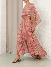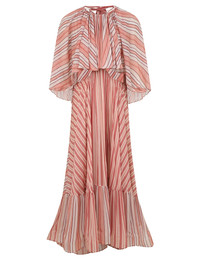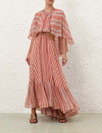 ITEM DETAILS The Rebellion Bohemian Maxi Dress in Red Stripe from our Cruise 2026 Collection, Twisted Romance. A maxi dress featuring a round neckline, exposed hip panels, a cropped shoulder cape overlay, and lace-up detailing at the centre back. - Full-length spliced gown - Mid-length sleeves - Cropped cape overlay across the shoulders - Side cut-outs at the waist - Lace-up detailing at back bodice - Gathered detailing throughout - Invisible zip closures at left side Style Code: 6670DC261 SIZE DETAILS 0P 0 1 2 3 4 Length 57 62 62 62 62.5 62.5 Bust 30 32.5 34 36 38 40 Designed to be slightly fitted at the bust Light-weight, non-stretchy fabric This garment fits true to size Available in size 0P, suited to clients who are under 5'3"/ 160cm Model is 5'9.5"/178 cm, bust size 32C/10C and wears a size 0 Item measurements are in inches CARE INSTRUCTIONS Main: 100% viscose; lining: 100% viscose Dry clean only code f (hydrocarbon only); Remove any detachable trims prior to dry cleaning; Cover to protect trim; Do not steam; Iron in low temperature with protective cloth; Do not spot clean Always check the label or care card for specific care instructions.
