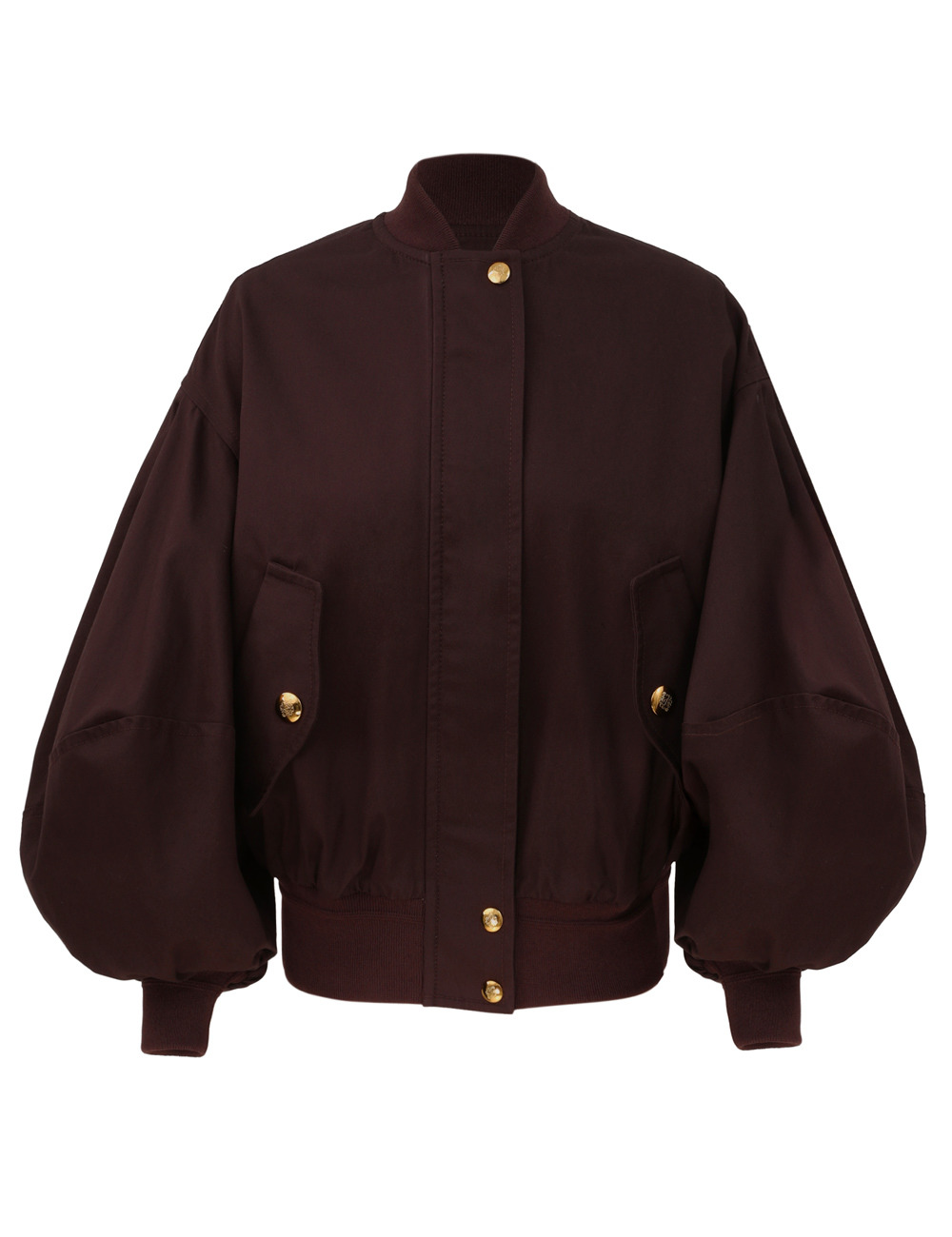 ITEM DETAILS The Rebellion Bomber Jacket in Mahogany from our Cruise 2026 Collection, Twisted Romance. A cotton bomber jacket featuring a ribbed stand collar, concealed front zip closure with snap buttons, and long blouson sleeves with elasticated cuffs. - Oversized cotton bomber jacket - Exaggerated long sleeves - Ribbed collar, cuffs and hem - Gold zip closure at centre front - Side seam pockets - Gathered detailing throughout Style Code: 6842JC261 SIZE DETAILS 0P 0 1 2 3 4 Length 25 27 27 27 27.5 27.5 Bust 49 50.5 53 54.5 56.5 59 Sleeve 20 21.5 21.5 21.5 21.5 21.5 Designed for an oversized fit This garment fits true to size Available in size 0P, suited to clients who are under 5'3"/ 160cm Model is 5'9.5"/178 cm, bust size 32C/10C and wears a size 0 Item measurements are in inches CARE INSTRUCTIONS Main: 100% cotton; contrast: ; bodice lining: 100% cotton; sleeve lining: 75% viscose, 25% silk Dry clean only code f (hydrocarbon only); Remove any detachable trims prior to dry cleaning; Cover to protect trim; Iron in low temperature with protective cloth; Light steam only; Do not spot clean Always check the label or care card for specific care instructions.